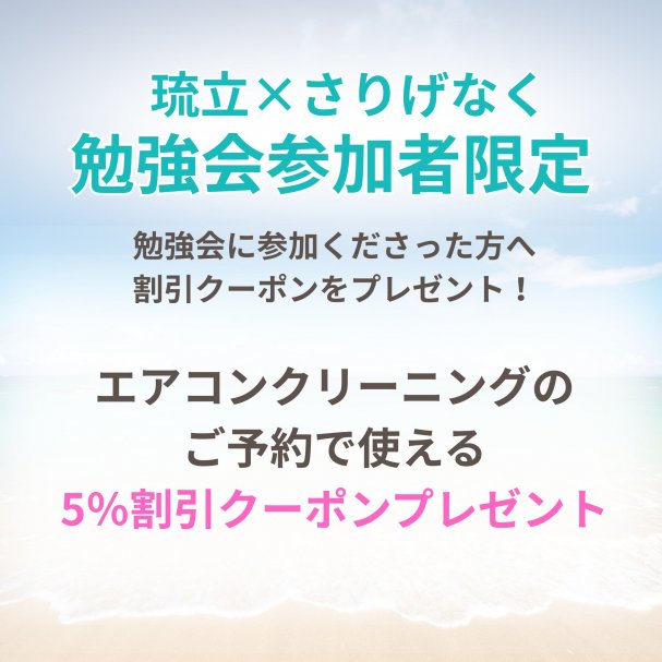 琉立×さりげなく「体と重曹の秘密」勉強会に参加された方へお配りしている限定クーポンです。 エアコン...