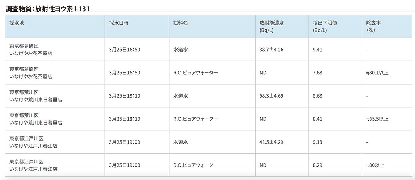 3店舗において水道水中に認められた放射性ヨウ素I-131が、自販機処理水からは検出下限値以下という検査結果となりました。尚、水道水中のヨウ素濃度が低かったため、最大除去率85.5%以上までの結果となりましたが、マーフィード自販機における放射性ヨウ素に対する除去性能が確認されました。