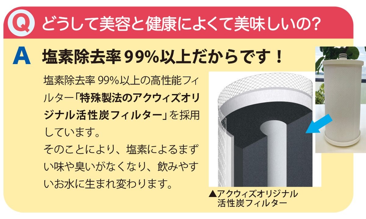塩素によるまずい味や臭いがなくなり、飲みやすいお水に生 まれ変わります。