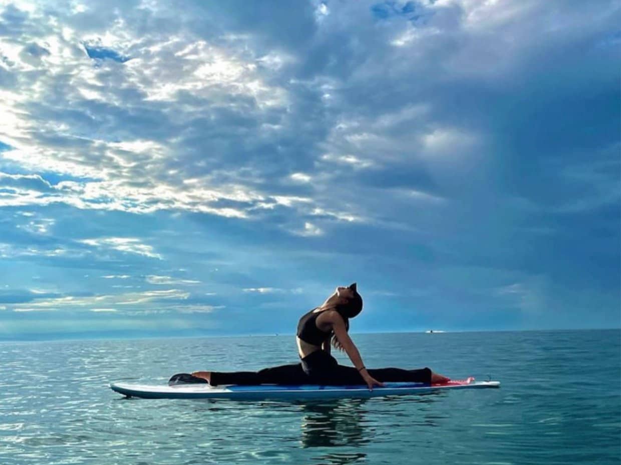 水の上で浮かびユラユラ揺れるスタンドアップパドルボードの上で、ヨガを行います。
