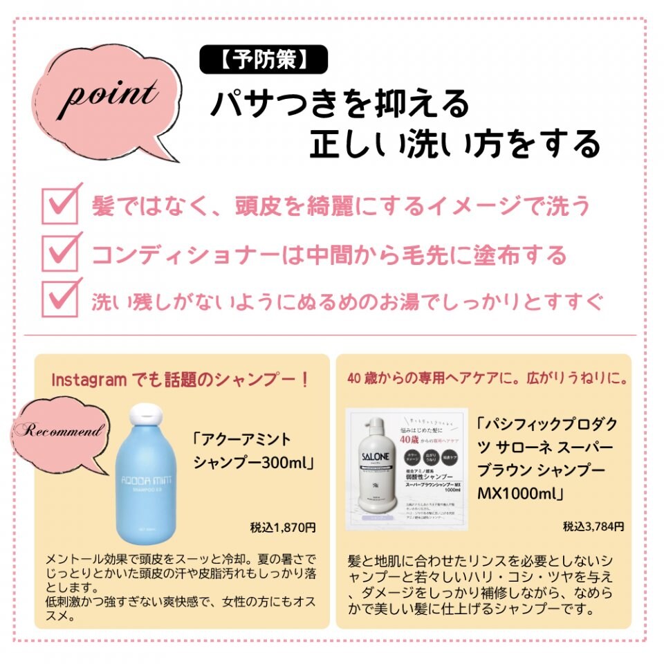 ①髪ではなく、頭皮を綺麗にするイメージで洗う②コンディショナーは中間から毛先に塗布する