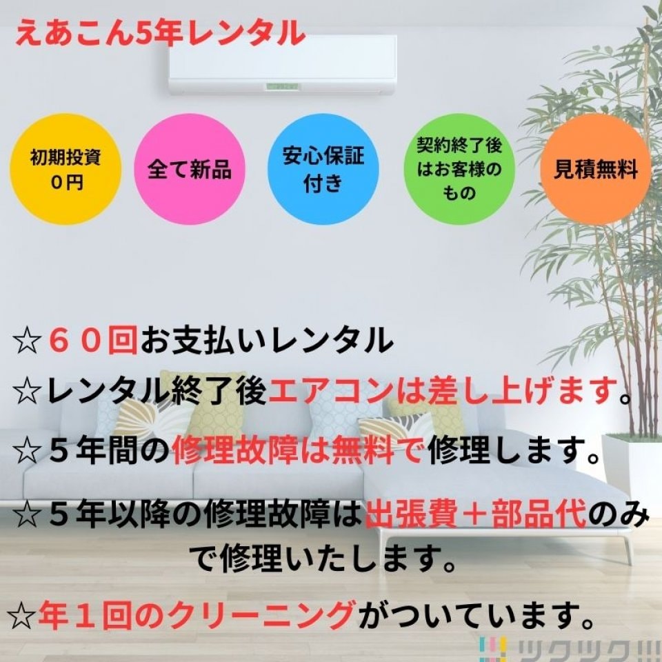 みなさん、えあこん5年レンタルのお話を聞くと「リース?」「支払いが終わると買取?それとも返却?」と言うお声が多いですが、弊社のえあこんレンタルは、買い取ることもなく、5年間のお支払いが終わるとお客様にエアコンを差し上げます。