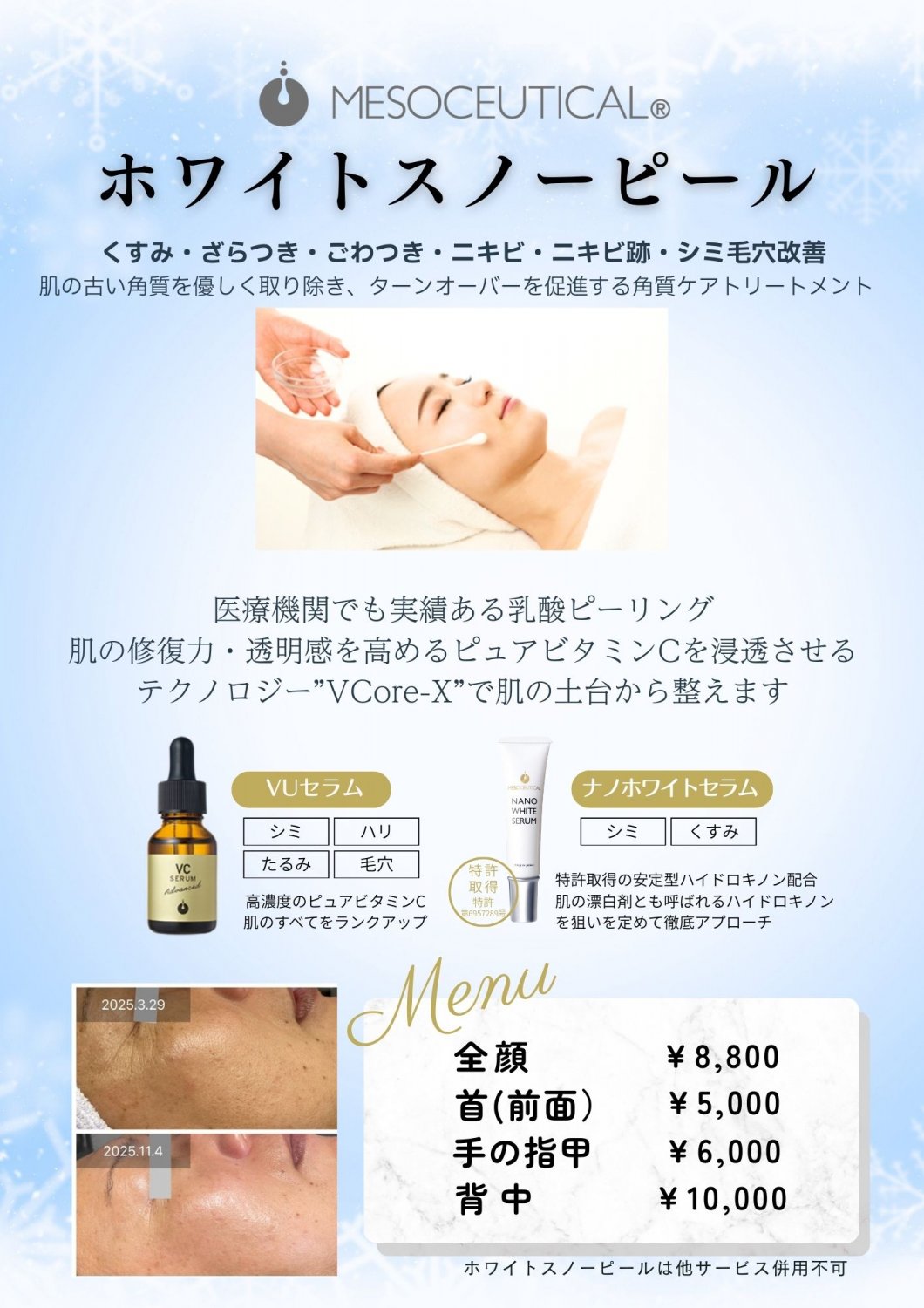 結果重視のブランド「メソシューテカル」の高濃度乳酸ピーリング◤ホワイトスノーピール◢
