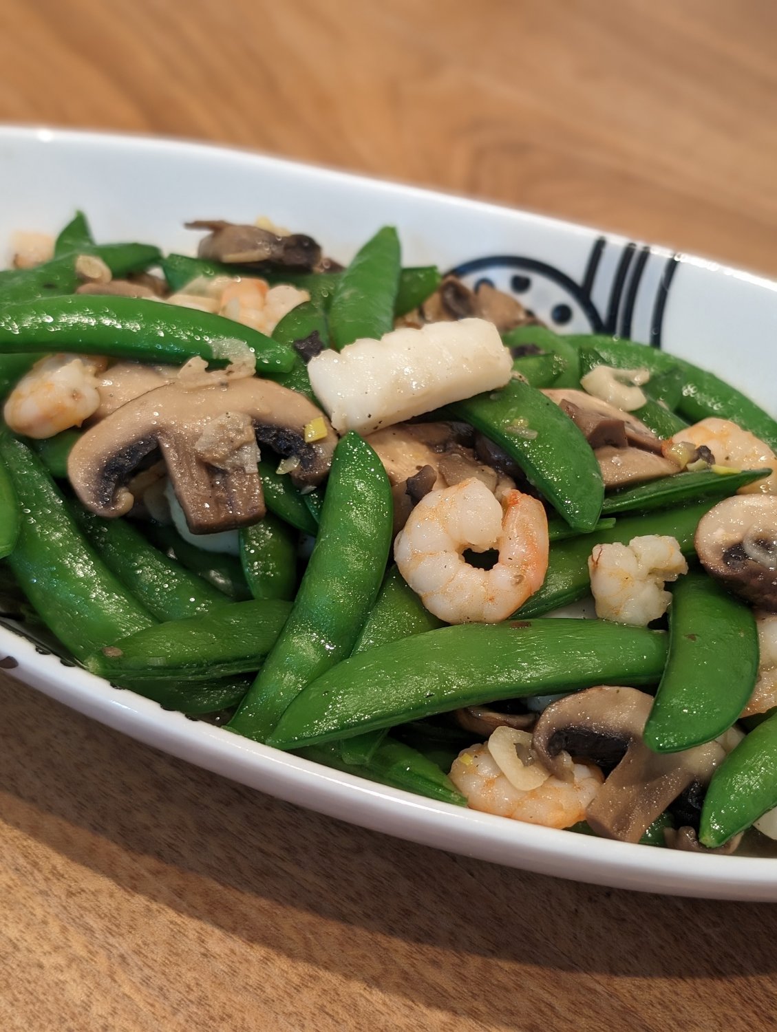 さっと茹でたスナップエンドウと魚介類(シーフードミックス等)を炒める。