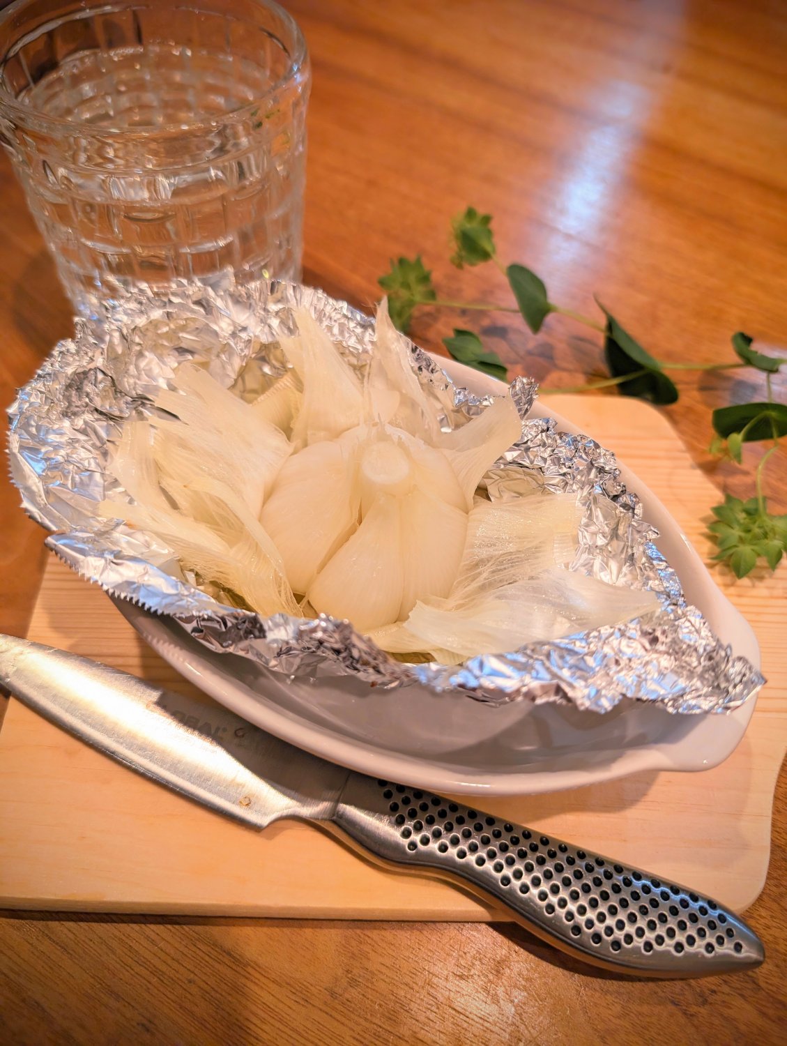 熱々の皮を丁寧に剥いていくと優しいニンニクの香りが広がります。
