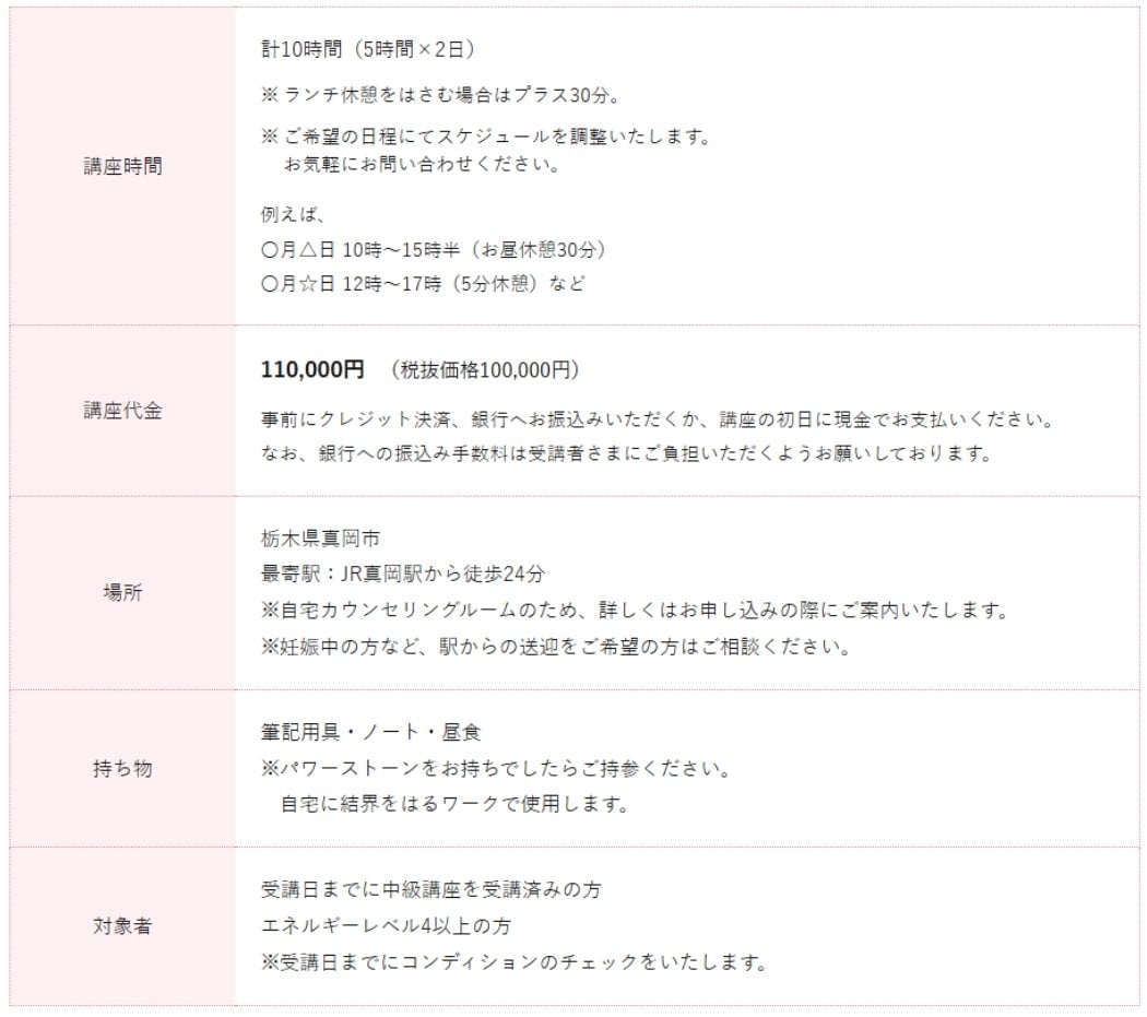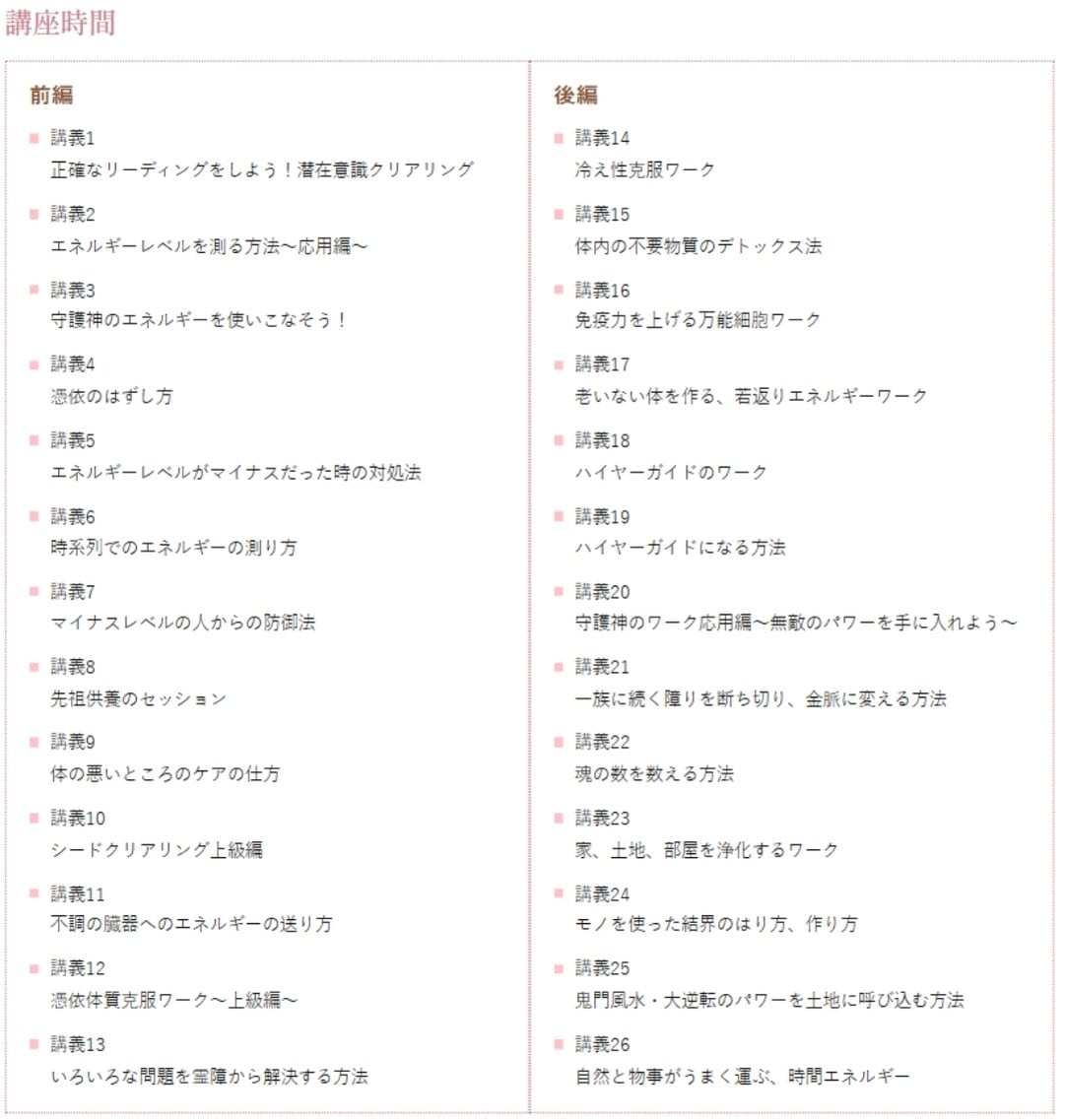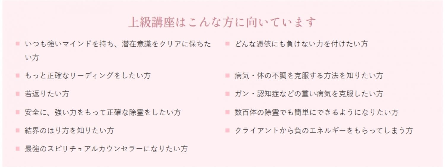 家を除霊したり、結界をはったり、魂の数を数えたり、スピリチュアルカウンセラーのプロとなるための講座となっています。