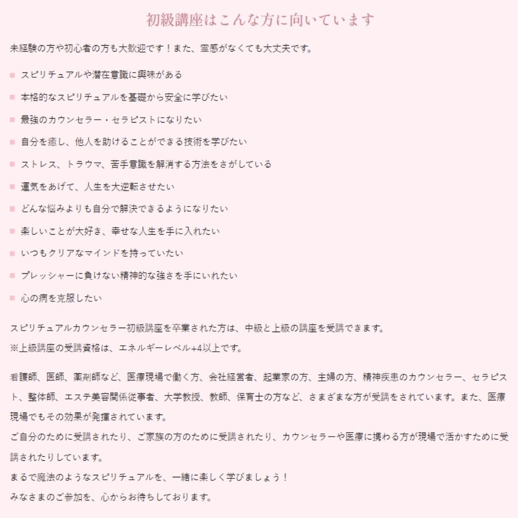 一般財団法人 日本スピリチュアルカウンセリング協会認定の、スピリチュアルカウンセラー養成講座初級です。