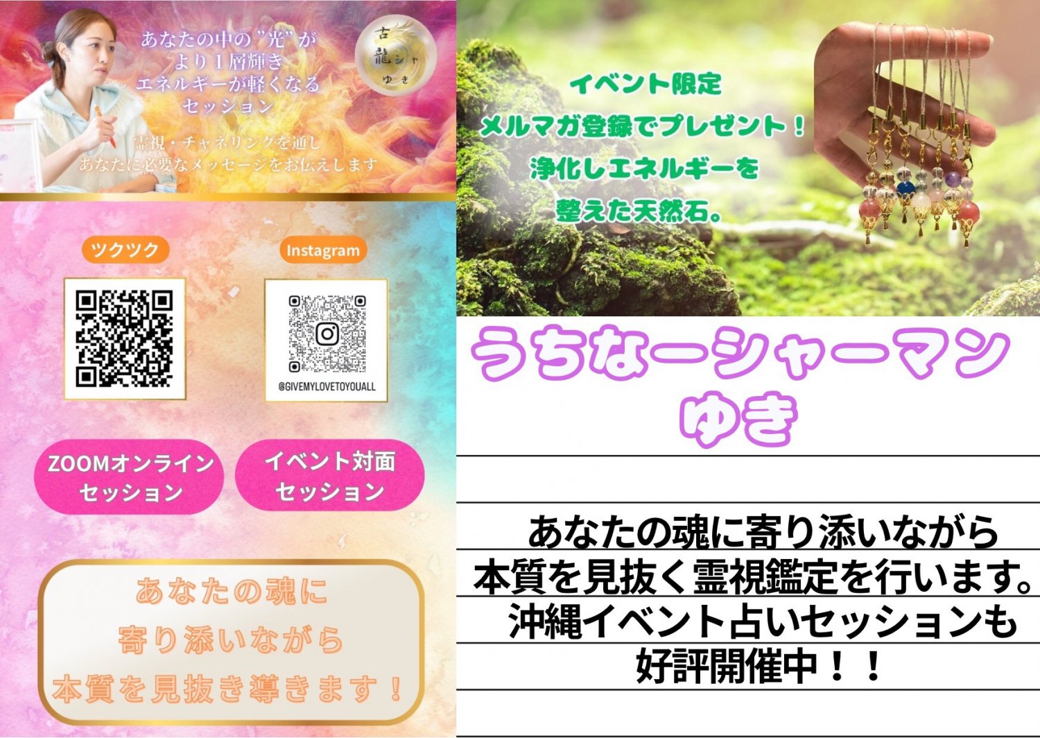 沖縄占いなら実力派占い師「うちなーシャーマンゆき」へ。霊視オンラインセッションで全国からのご相談に対応し、あなたの魂に寄り添いながら本質を見抜く霊視鑑定を行います。沖縄イベント占いセッションも好評開催中。