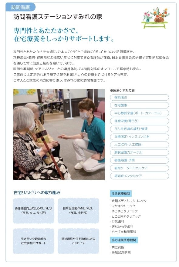 堺市南区「希望苑はなゆら桃山台」中区「いきいき希望苑泉ヶ丘」「フォーユー堺東山」、大阪市平野区「スマイルハウスⅤ」の高齢者施設での訪問看護を展開しています。