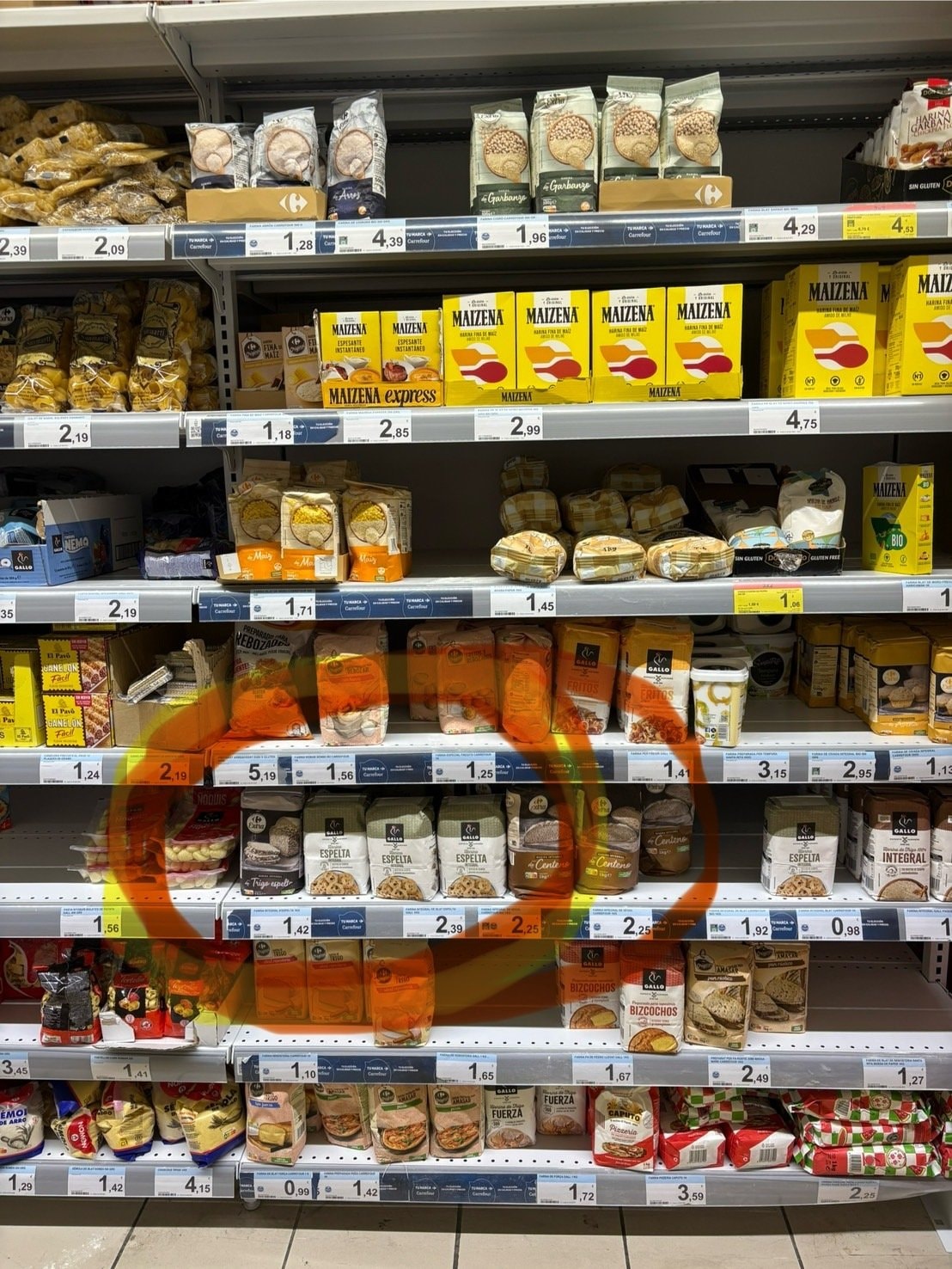 (スペイン・バルセロナのスーパーの小麦粉の陳列棚に並ぶスペルト)