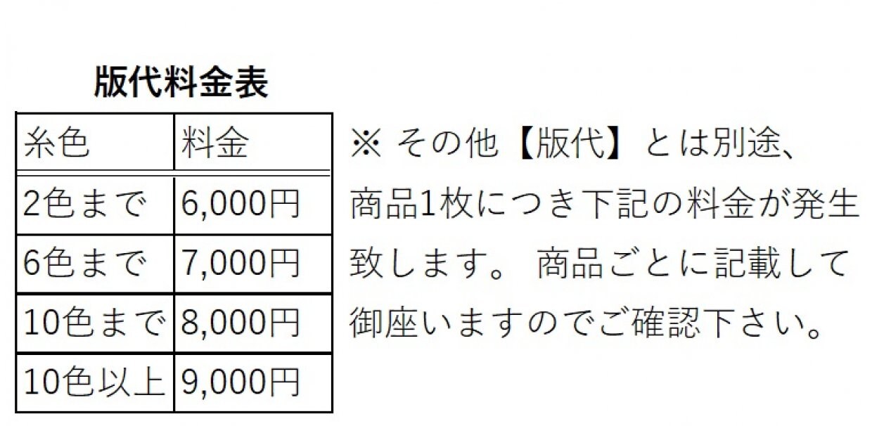※同じ【版】で製作する場合には2回目以降は【版代】はご購入いただく必要は御座いません。
