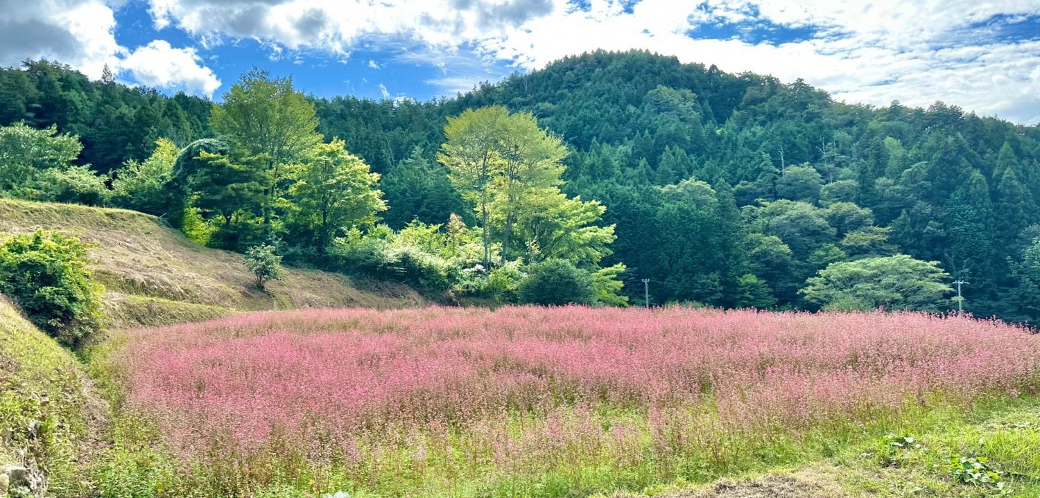 標高650mの中山間地域の遊休地を活用して希少な赤そば(高嶺ルビー)を植えて景観維持に15年前ほどから努めています。高嶺ルビーの花は濃いピンク色で緑色一色の山の景色に彩りを添え、地域の方々のも喜んでいただいております。毎年満開の時期になると花見会を開催され「幻のそば屋」も開店いたします。
