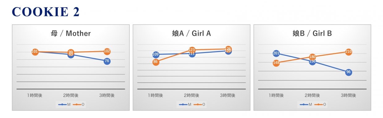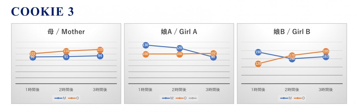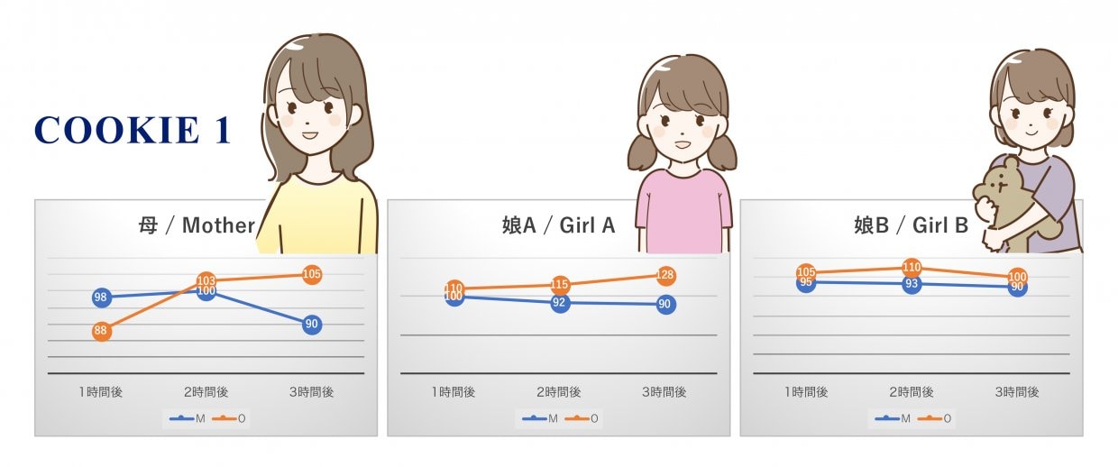 今回はミラクルクッキー誕生記念として、そのご家族にモニター協力をしていただき、血糖値の上がり方などの記録をして頂きました。