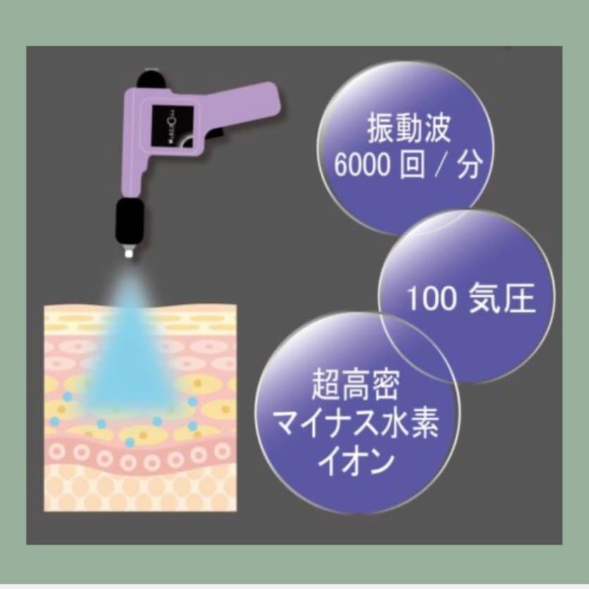 一般水(ph7)の50万倍の電子をもった「超」高エネルギー水(水素電子水)を、100気圧6,000回/分の振動派で患部へ打ち込むという世界初の技術を採用。(※特許出願中)