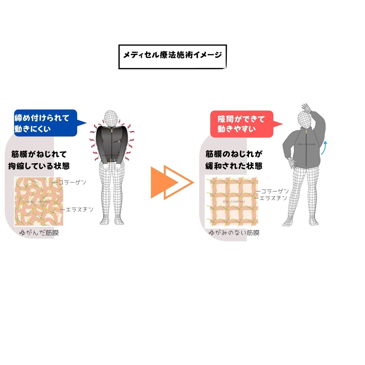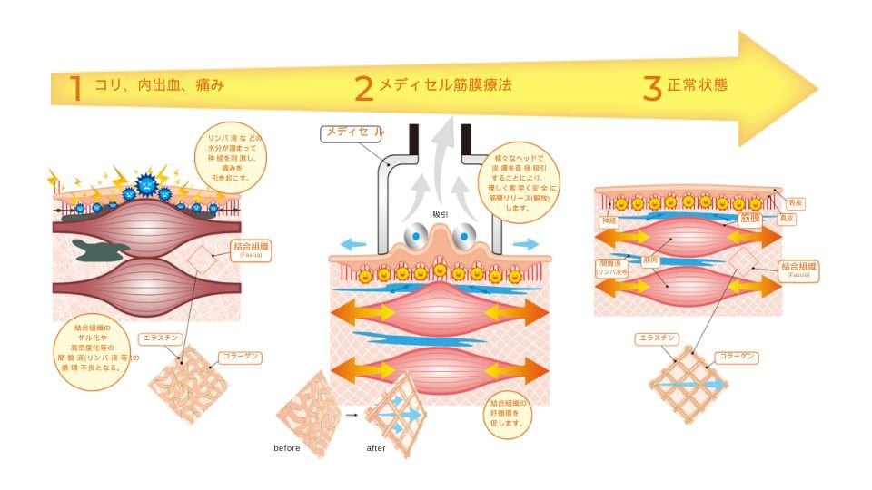 その癒着に対してメディセルという機器を用い、〝押す刺激〟ではなく〝引く〟ことにより癒着を解消し日常の痛みや、動きの不調を解消してくれます。