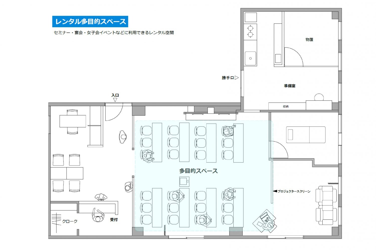 テーブルと椅子をスクール形式にレイアウトすることで、最大約30人ほど収容が出来るセミナースペースとしての利用も可能です。