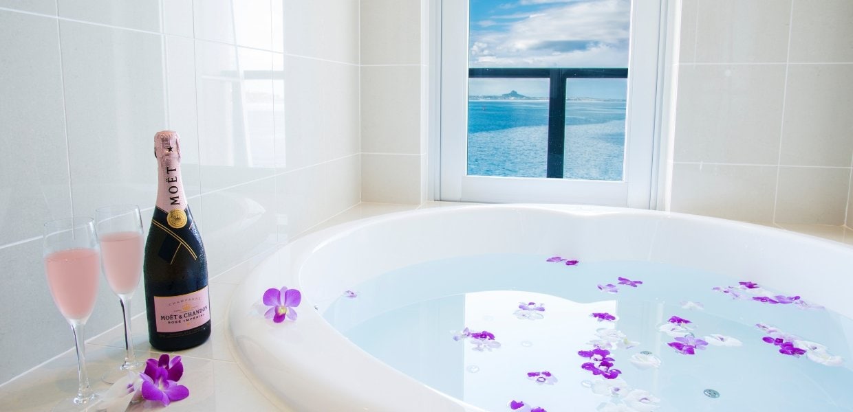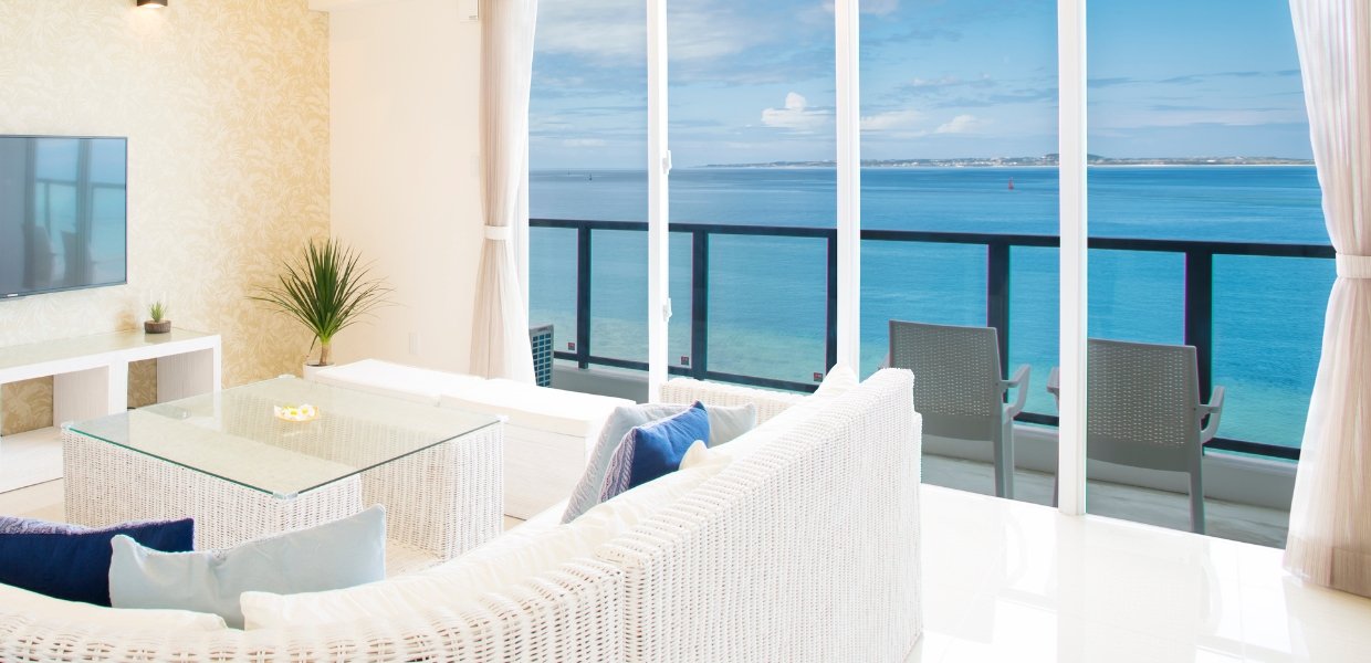 模した客室からは沖縄ブルーの青空と海が広がり、