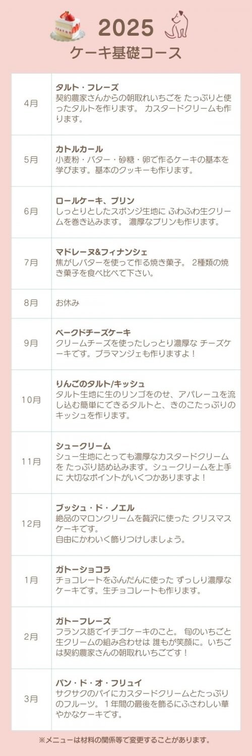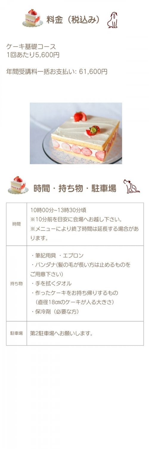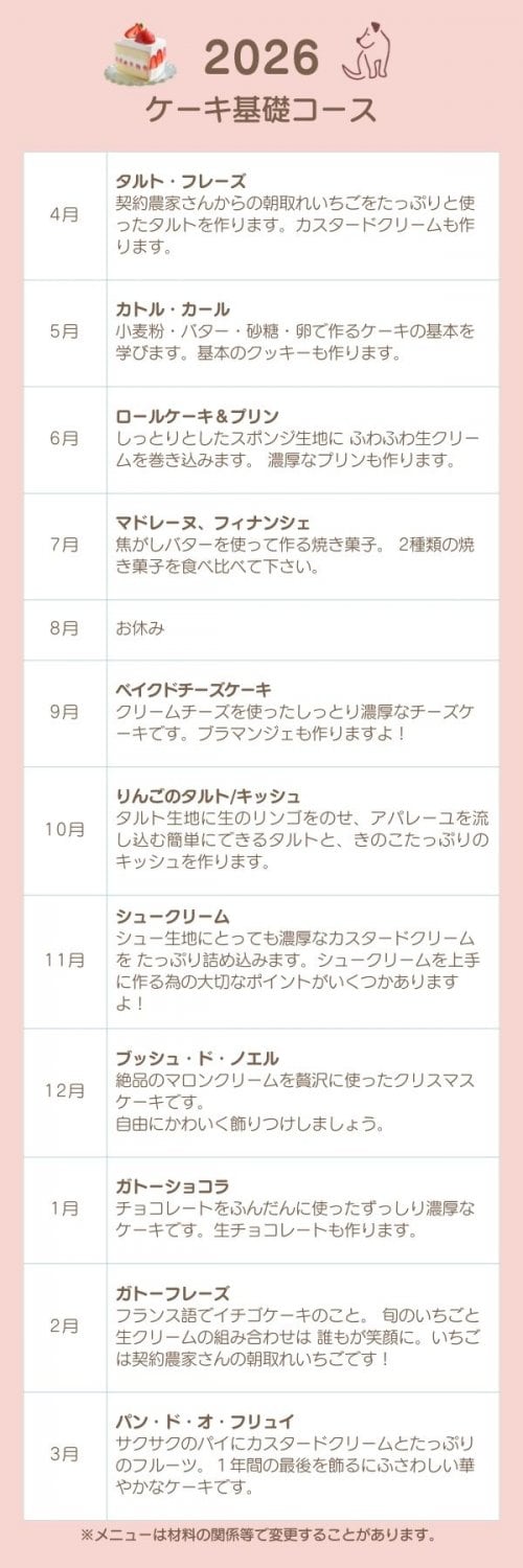 ケーキを1台お持ち帰りできます。試食もありますよ! 2022年から1年コースを半年ずつのコースにリニューアル!