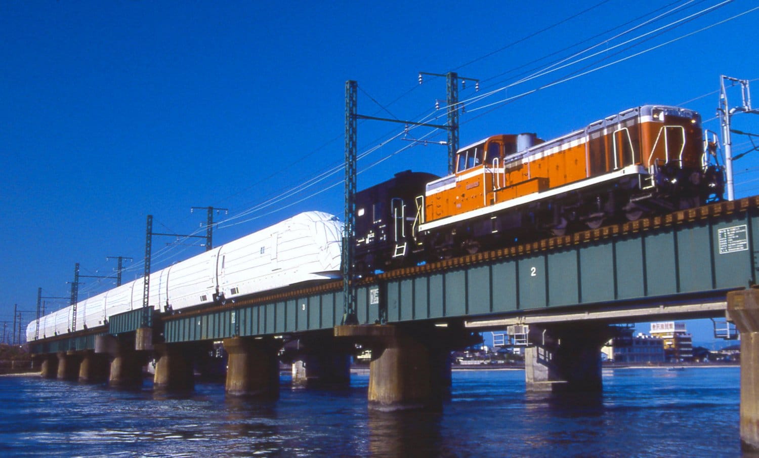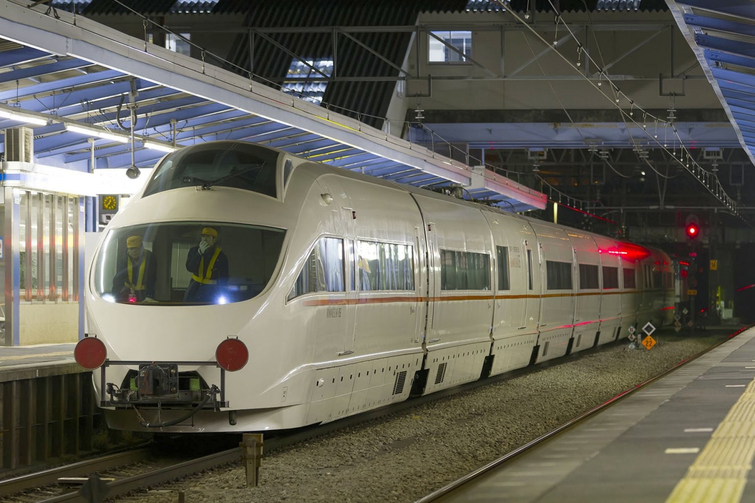 ▼ プレス発表までは、その美しい容姿を公開しないことを前提に、新車輸送時は編成全体に防汚用のマスキングが施されていました。ホームから眺める範囲では、フルカウリングの真っ白な車体と、美しいシルエットしか把握することができず、「ヘッドライトはドコに付いているのか?」「ロゴはドコに付いているのか?」と、ベールに包まれた姿から様々な憶測が飛び交ったものでした。