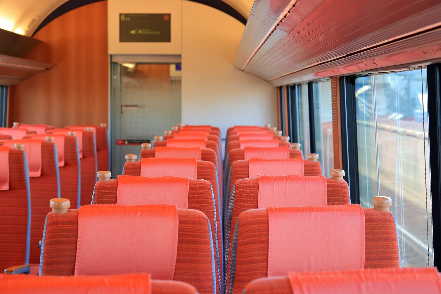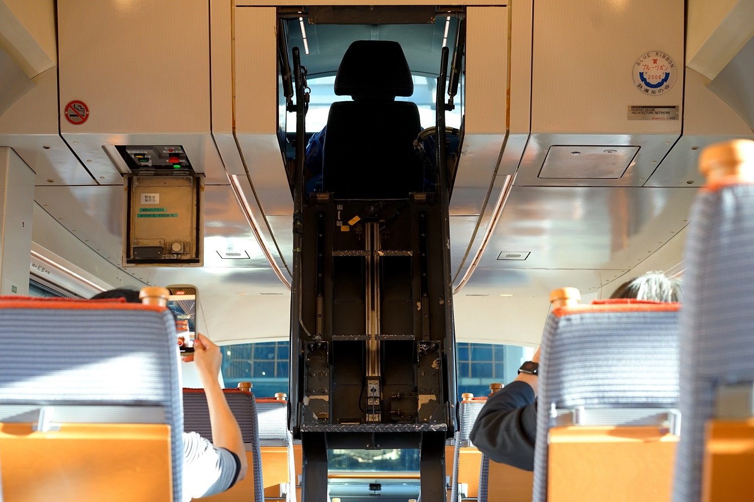 ▼ 展望席で目を引く要素は、何と言っても前頭部の大型曲面ガラスでしょう。緩やかな円弧を描くボディラインに沿って、大型の1枚ガラスをはめ込むことにより、すっきりとした視界の確保に成功しています。これだけの曲率を有する大きなフロントガラスを、メーカーさんはどのように製作したのでしょうね。