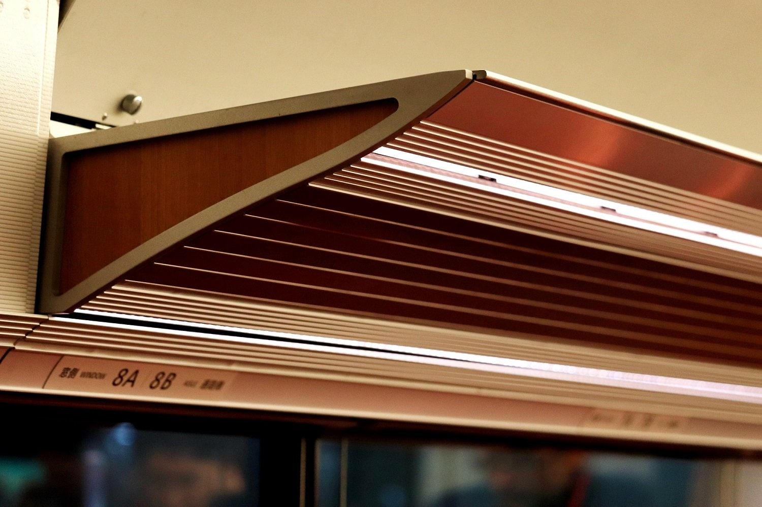 ▼ 鉄道車両の荷棚というと、樹脂製のはめ込みタイプが多い中で、VSEではアルミ中空押出材を使用した意匠性の高いものが採用されています。木目とメタリックパーツが融合し、底板にはライン状のLEDユニット灯を2列配置することで躍動感が生まれています。