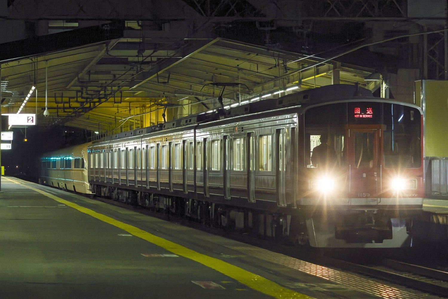 ▼ 小田急線からの発送作業は、深夜にひっそりと行われました。車庫がある海老名駅から、JR線への連絡線を有する新松田駅までは、通常ペアを組むことがない通勤電車に牽引され、低速で慎重に回送されていきました。第1編成の回送時には、赤色の通勤電車が牽引を担当して話題を呼びました。