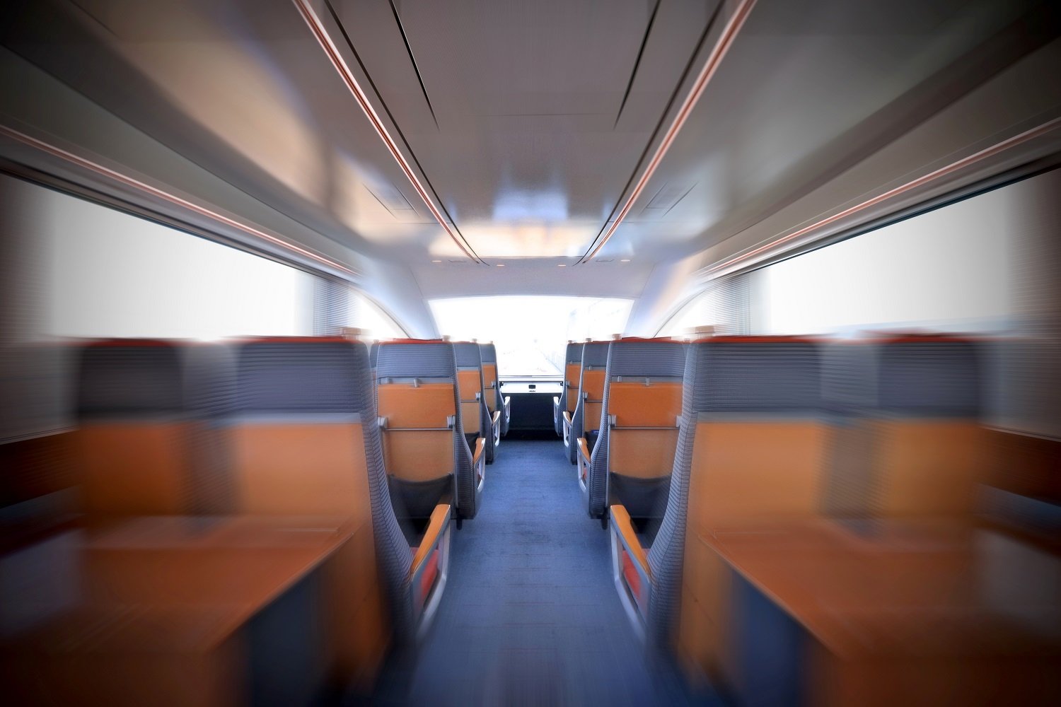 ▼ 展望席の天井は緩やかな円弧を描き、まるでフロントガラスへ吸い込まれるような意匠となっています。照明はライン状のLEDユニットとダウンライトのみで、空間に不要な凹凸を出すことなく、すっきりと前方の景色を楽しめるように配慮されています。
