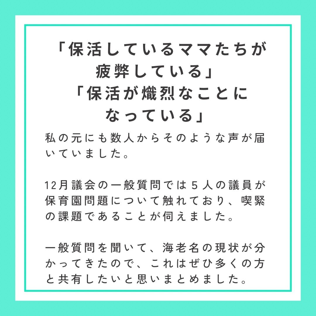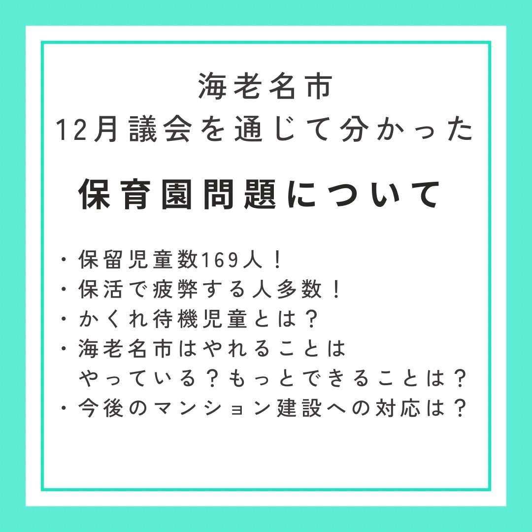 12月の海老名市議会では、多くの議員が一般質問で保育園の待機児童問題について取り上げました。