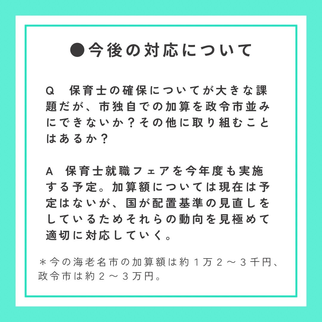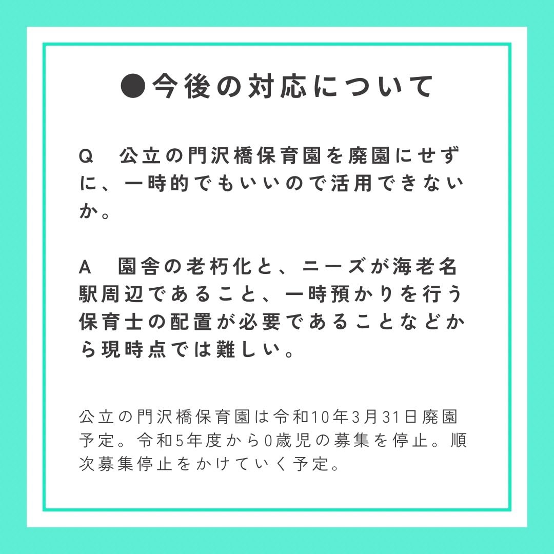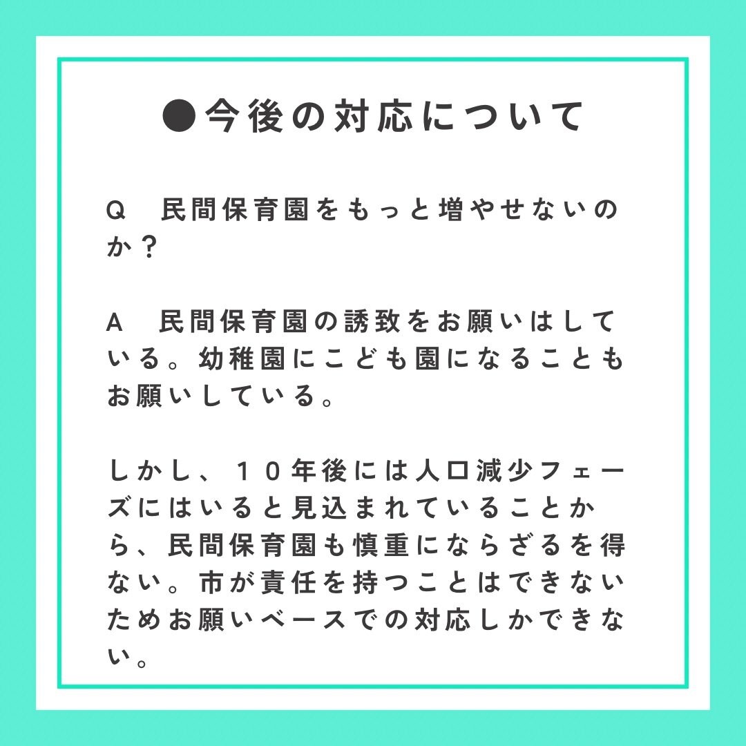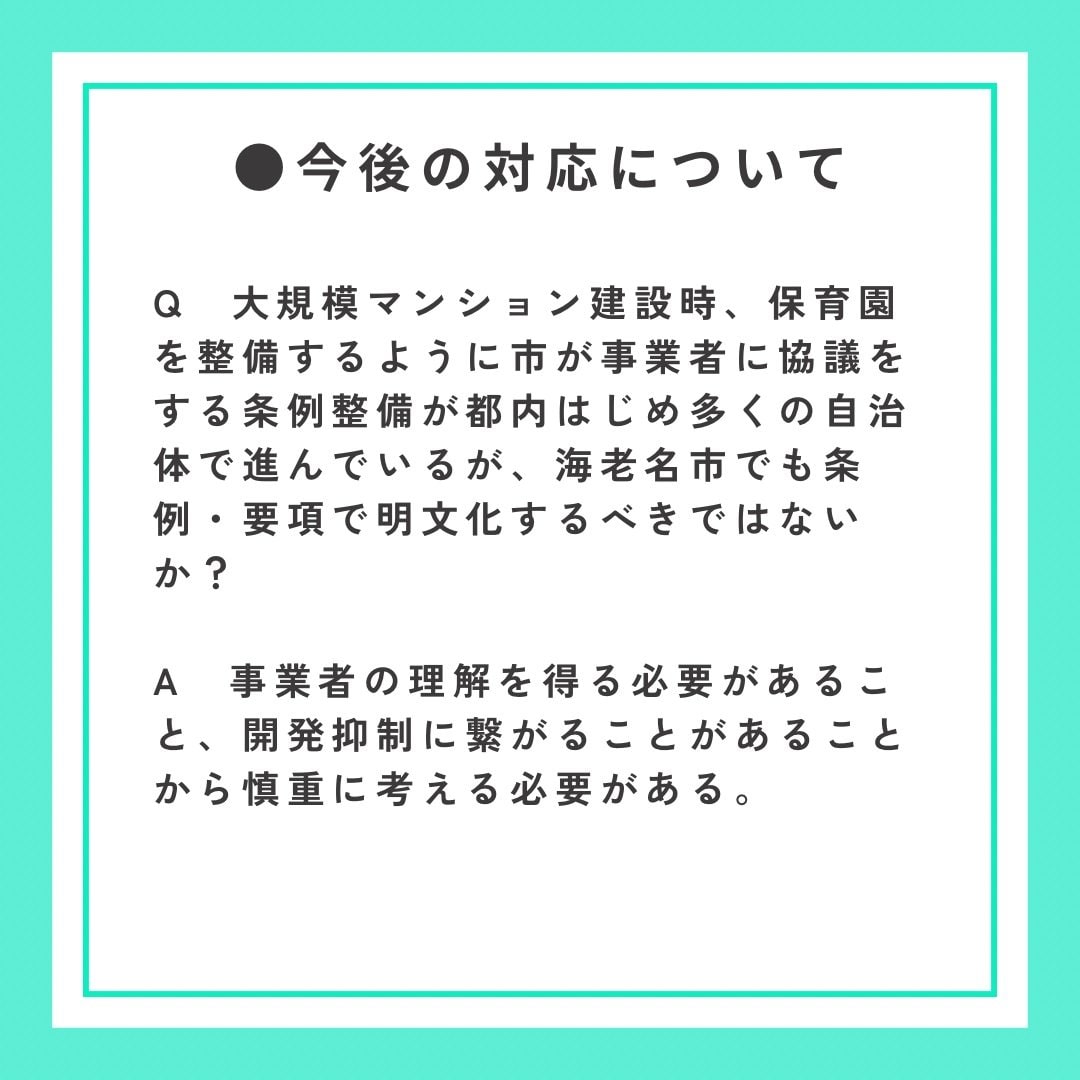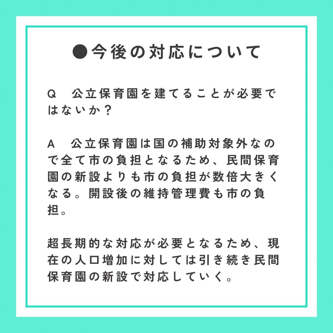 市役所周辺の開発で約3500人の人口増が見込まれていますが、マンション建設の際に企業側に保育所併設を協議することさえやらないとしているのは、保留児童の問題に本気で取り組む気がないのでは?と思われても仕方がないと思います。