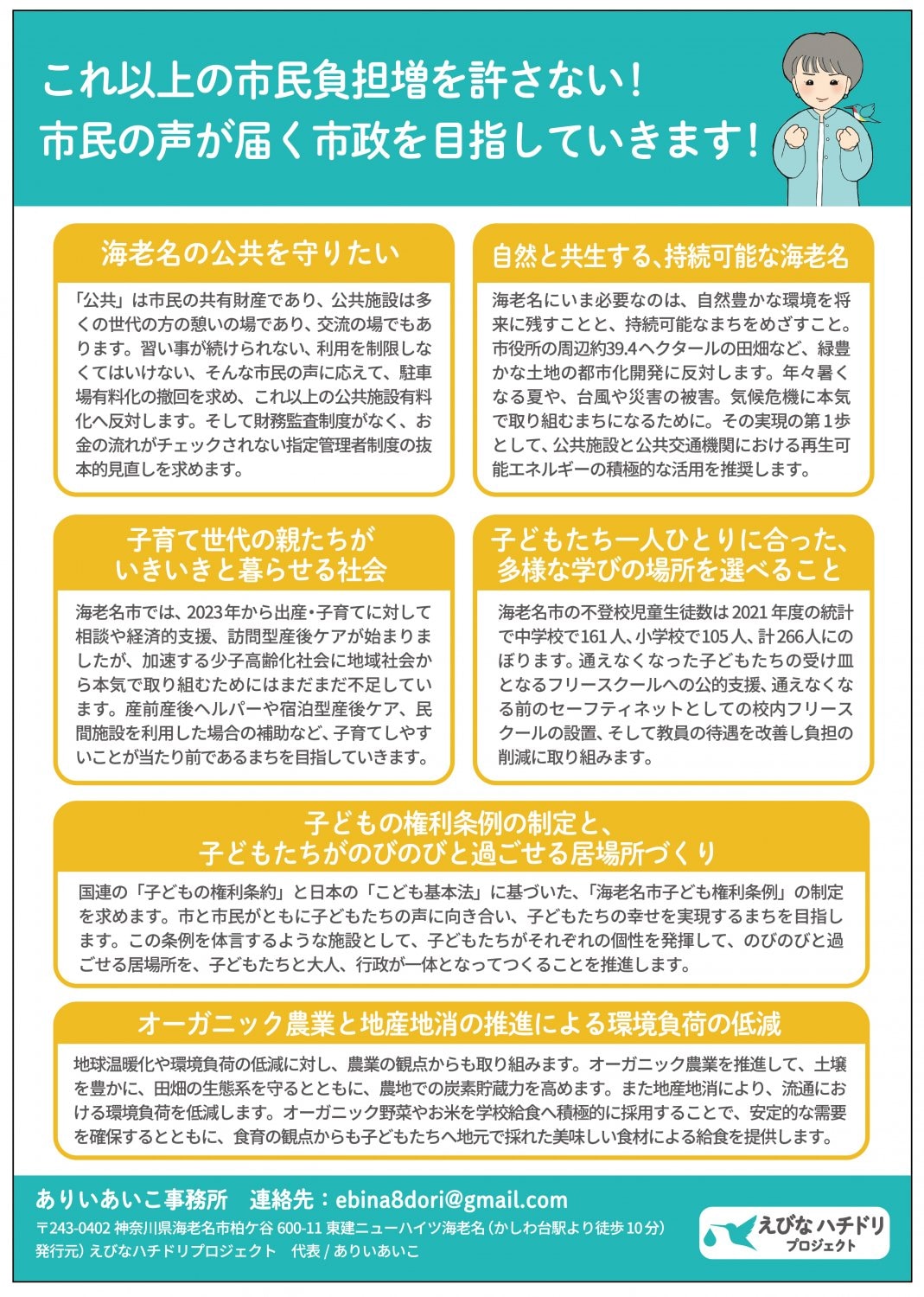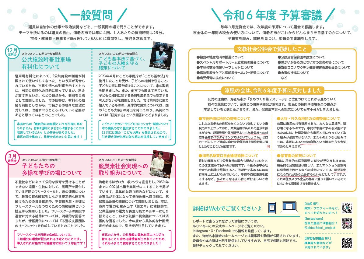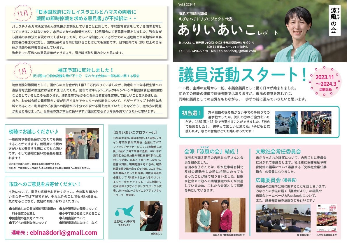 議員活動報告、およびえびなハチドリプロジェクトの政策チラシの閲覧、ダウンロードができます。
