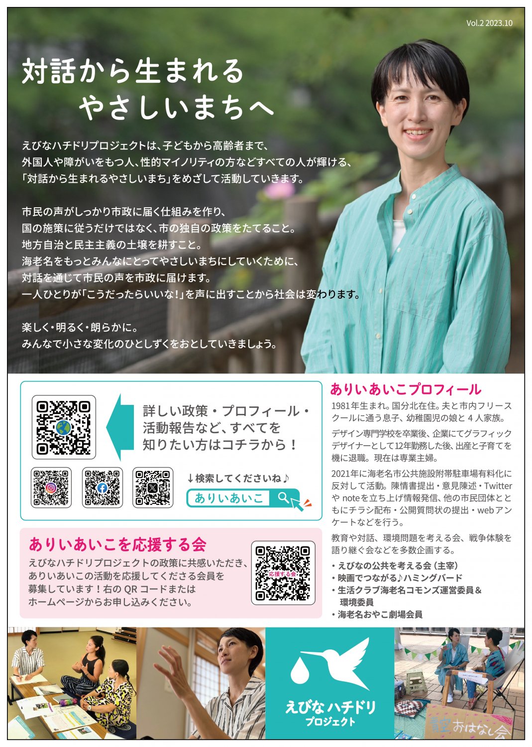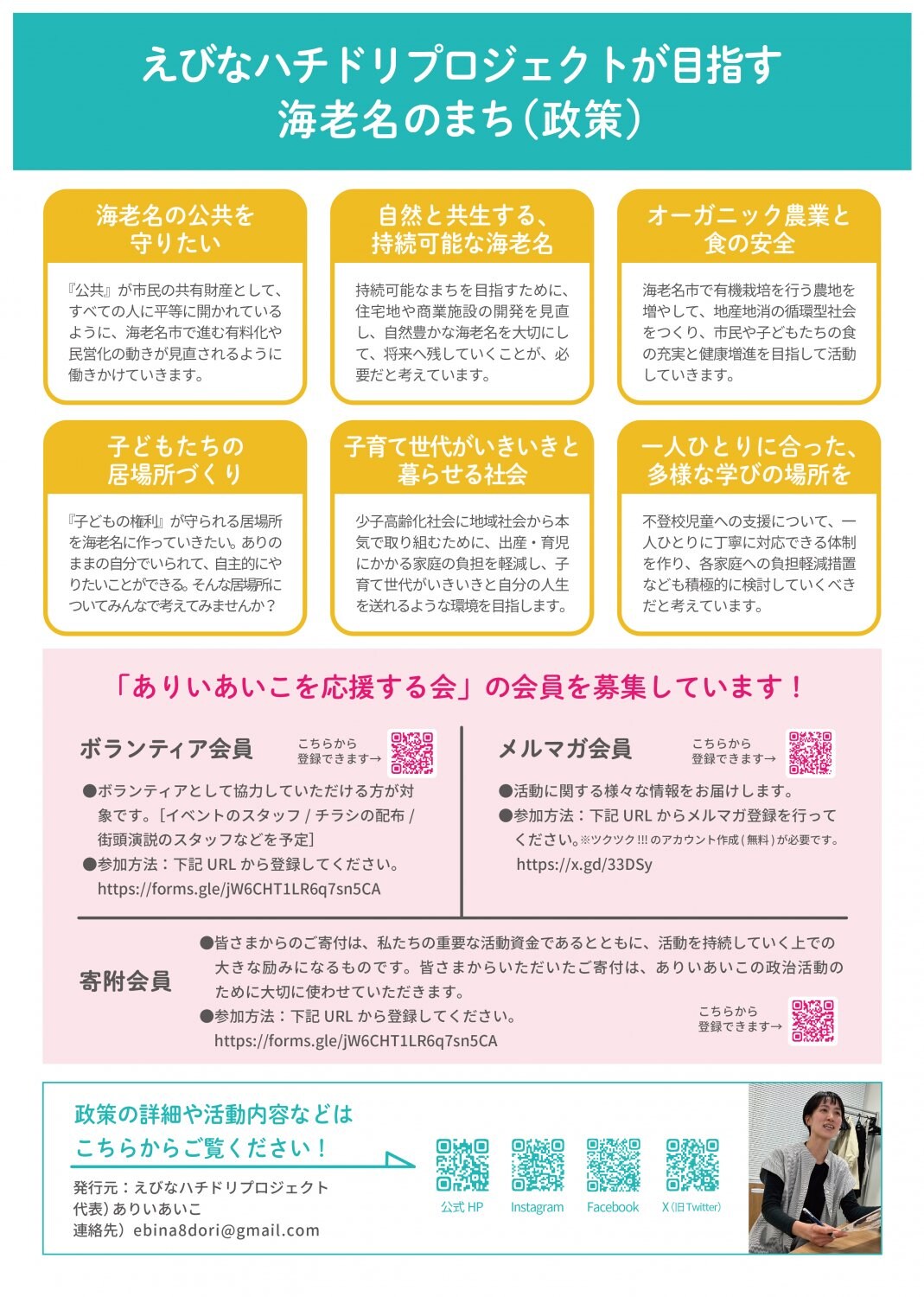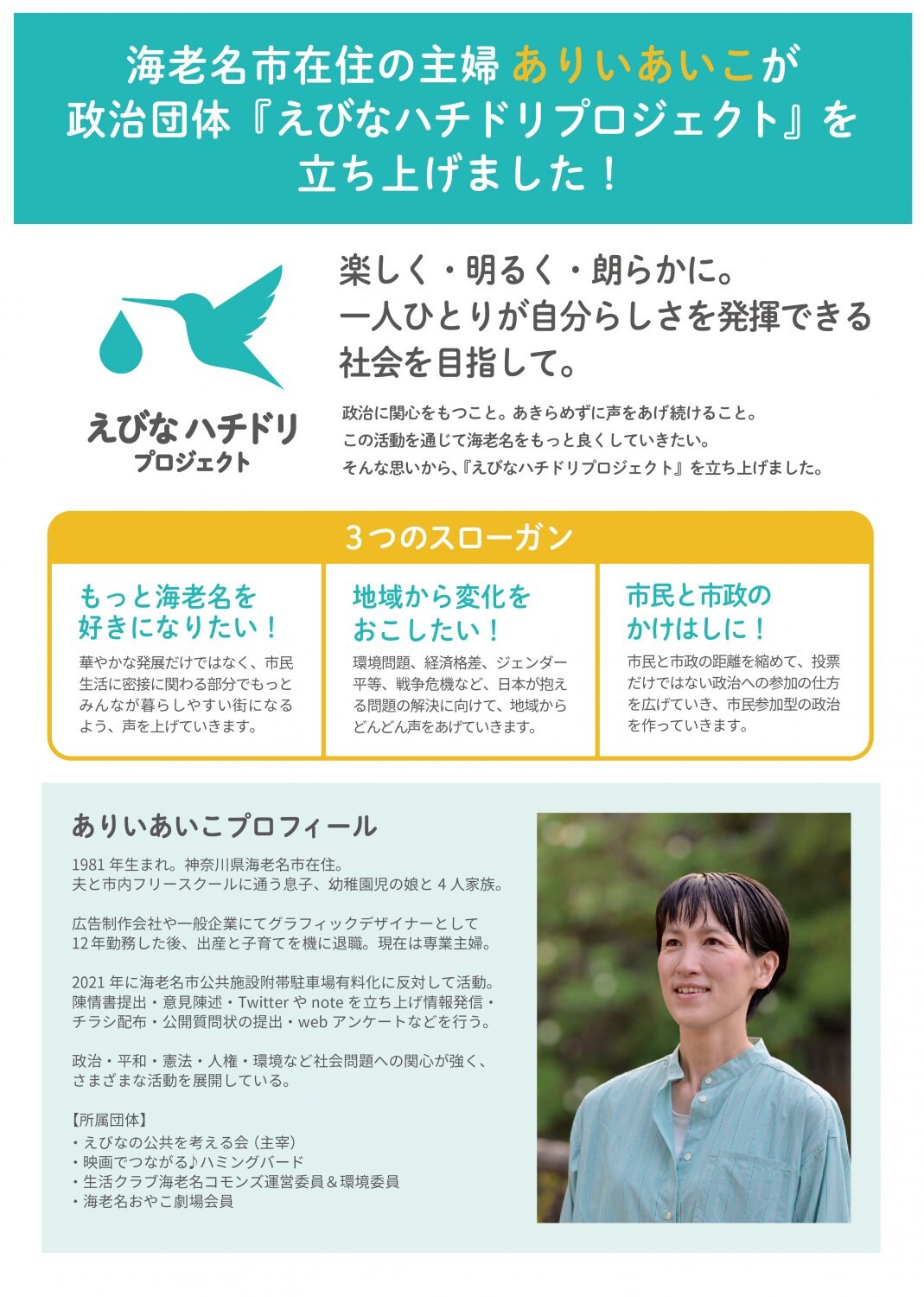 議員活動報告、およびえびなハチドリプロジェクトの政策チラシの閲覧、ダウンロードができます。