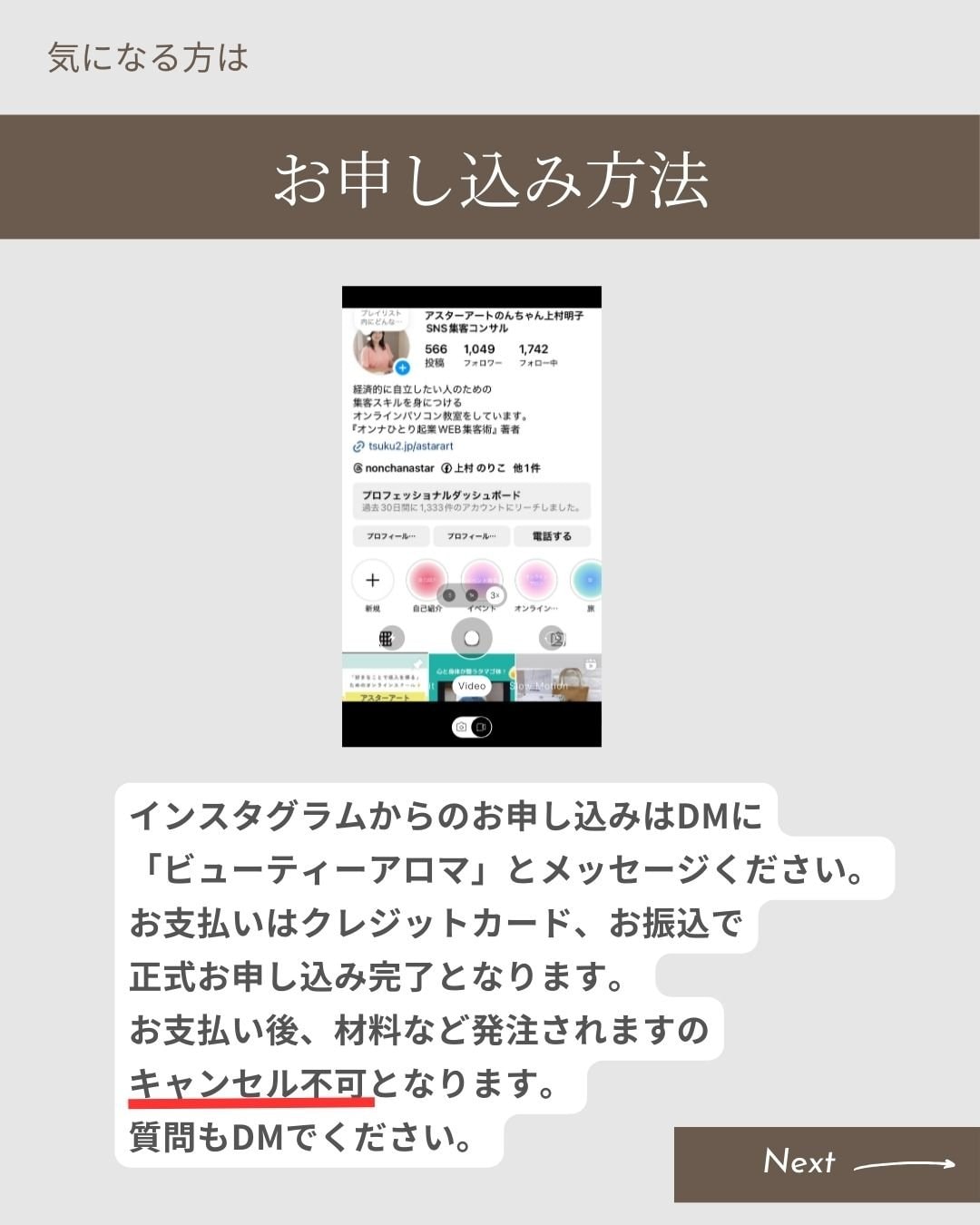 お申し込み方法インスタグラムからのお申し込みはDMに「ビューティーアロマ」とメッセージください。お支払いはクレジットカード、お振込で正式お申し込み完了となります。お支払い後、材料など発注されますのキャンセル不可となります。質問もDMでください。