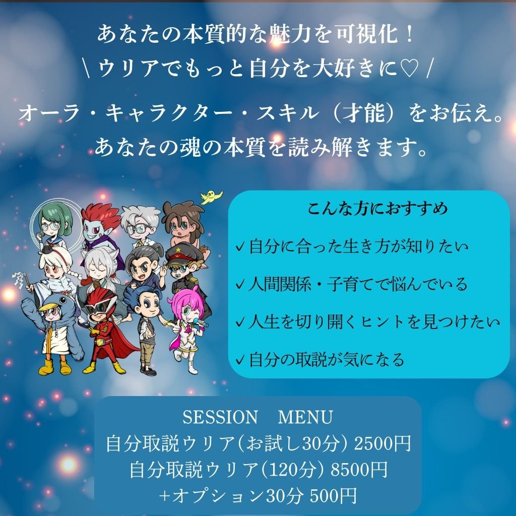 そのような“ウリア”の世界観に基づき、唯一無二のあなただけの取り扱い説明書を解説いたします。産まれ持った才能・オーラ・キャラクターを知り、あなたが魂の本質を生きるための鍵をお渡しします。