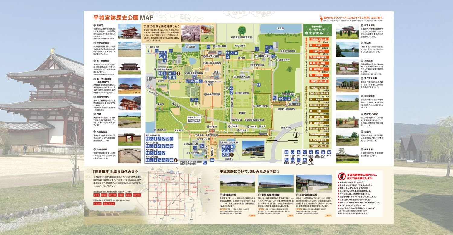 朱雀大路を挟んで東側は平城宮いざない館、西側は観光交流施設が整備され、古都奈良の魅力を楽しんで頂ける空間となっています。