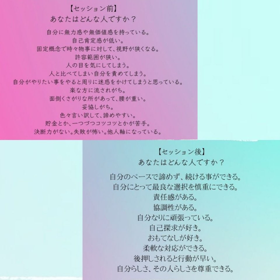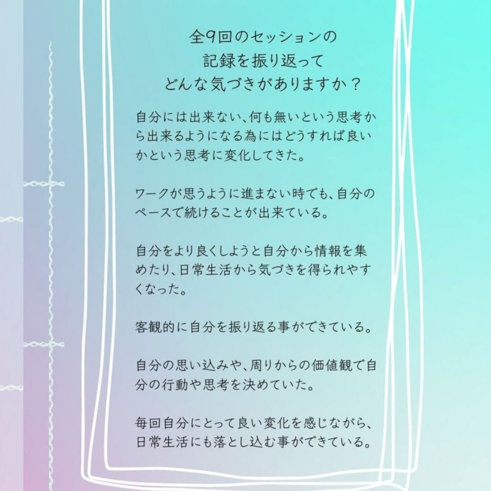どれもこれも思い当たる事ばかりで、このタイミングでこのセラピーを受けたことに大きな意味があると感じました。ポジティブに表れたりネガティブに表れたりするというのは、自分の解釈次第ということがまたまた腑に落ちました。私の人生のミッションが、物質的な豊かさを追い求めていい!、人脈を広げてみんなで豊かになろうということだとわかったことは力をもらった気がします。そのカギとなるのが楽しく明るくというのも納得です!
