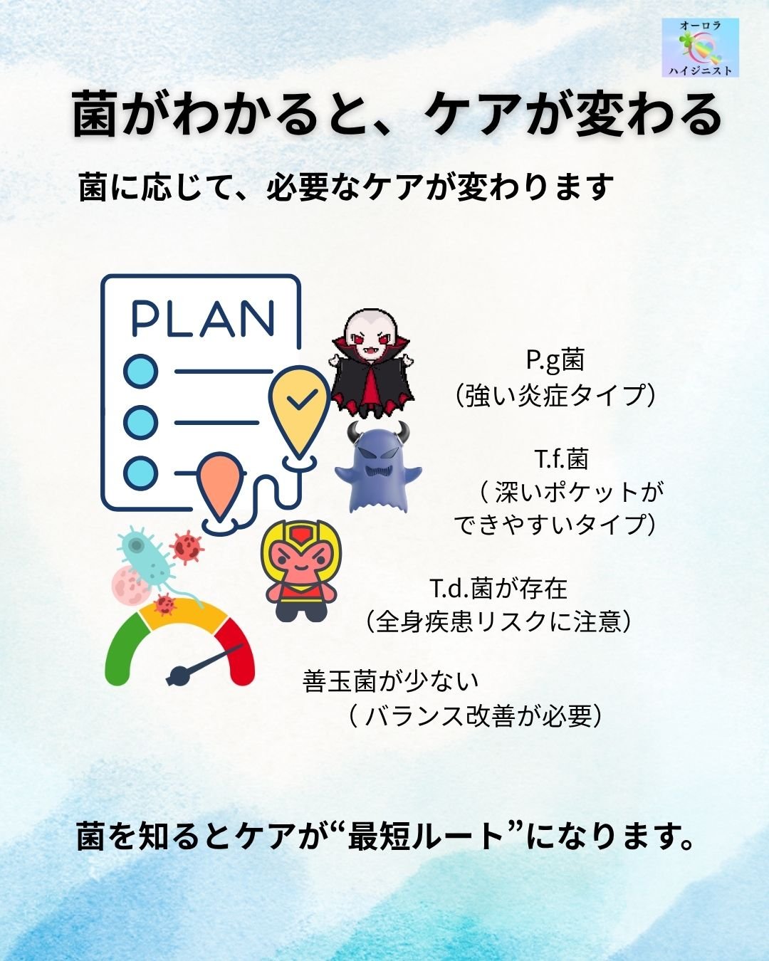 この検査を活用することで、「自分のお口の中にどんな菌が多いか」「どの菌がリスク因子として働いている可能性があるか」を、データとして理解できます。