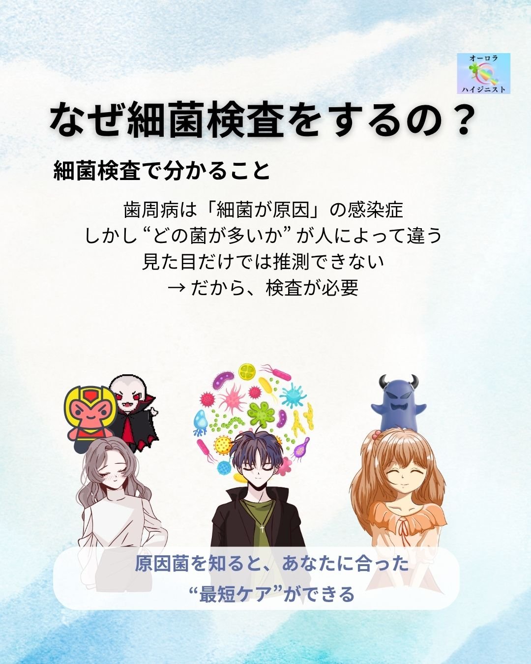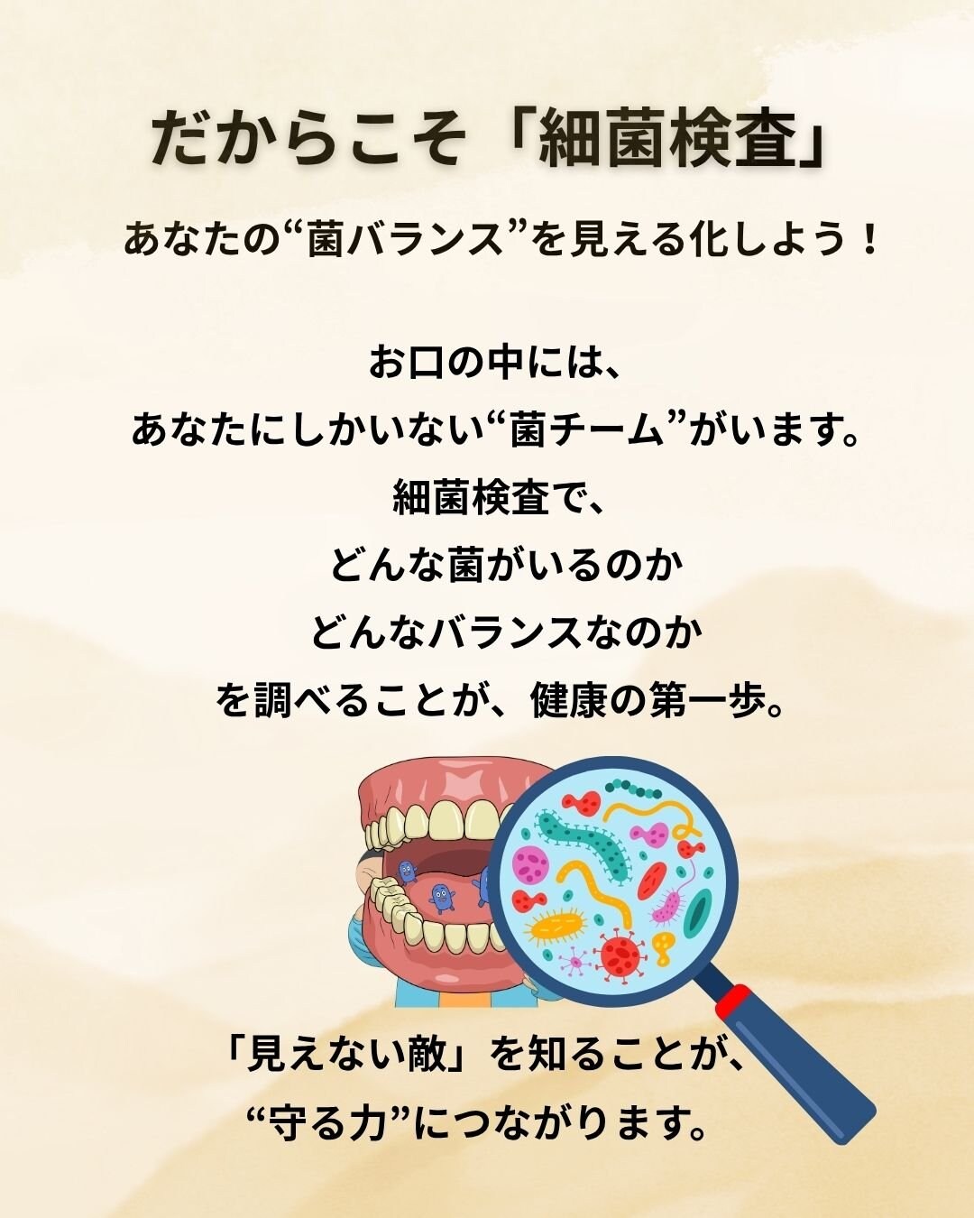 お口の中にいる“菌の世界”を知ることで、虫歯・歯周病だけでなく、全身の健康へもつながる第一歩を踏み出せます。