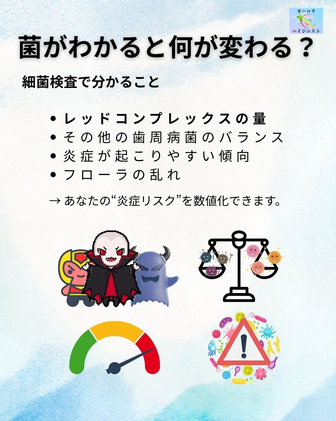 この検査では、口腔内細菌のバランスとともに、特に注意すべき菌・グループも把握できます。