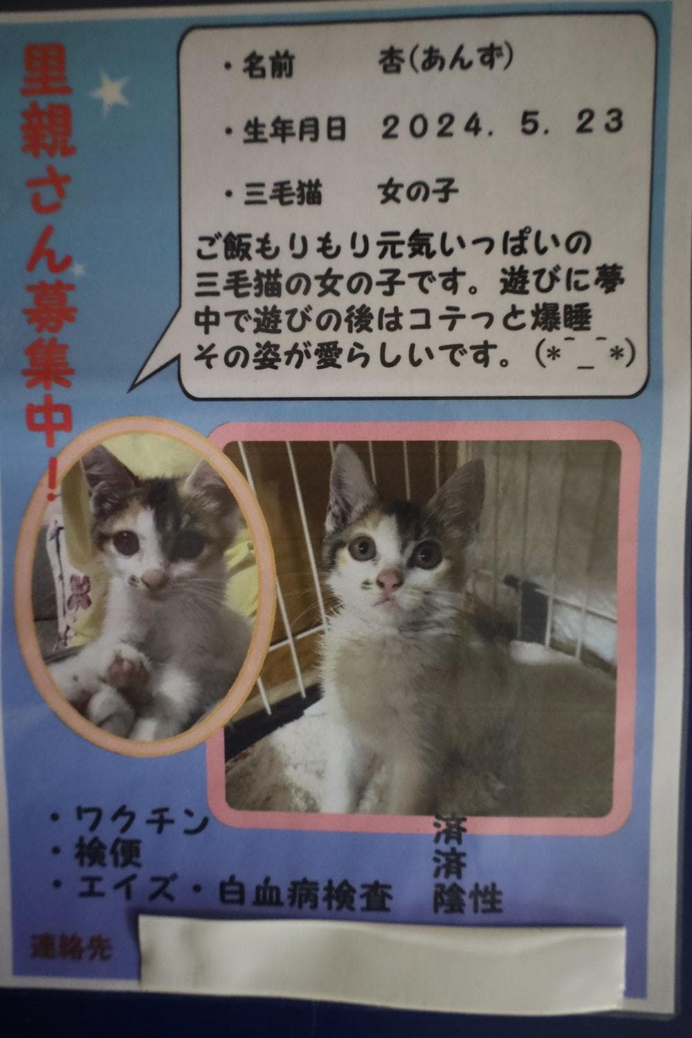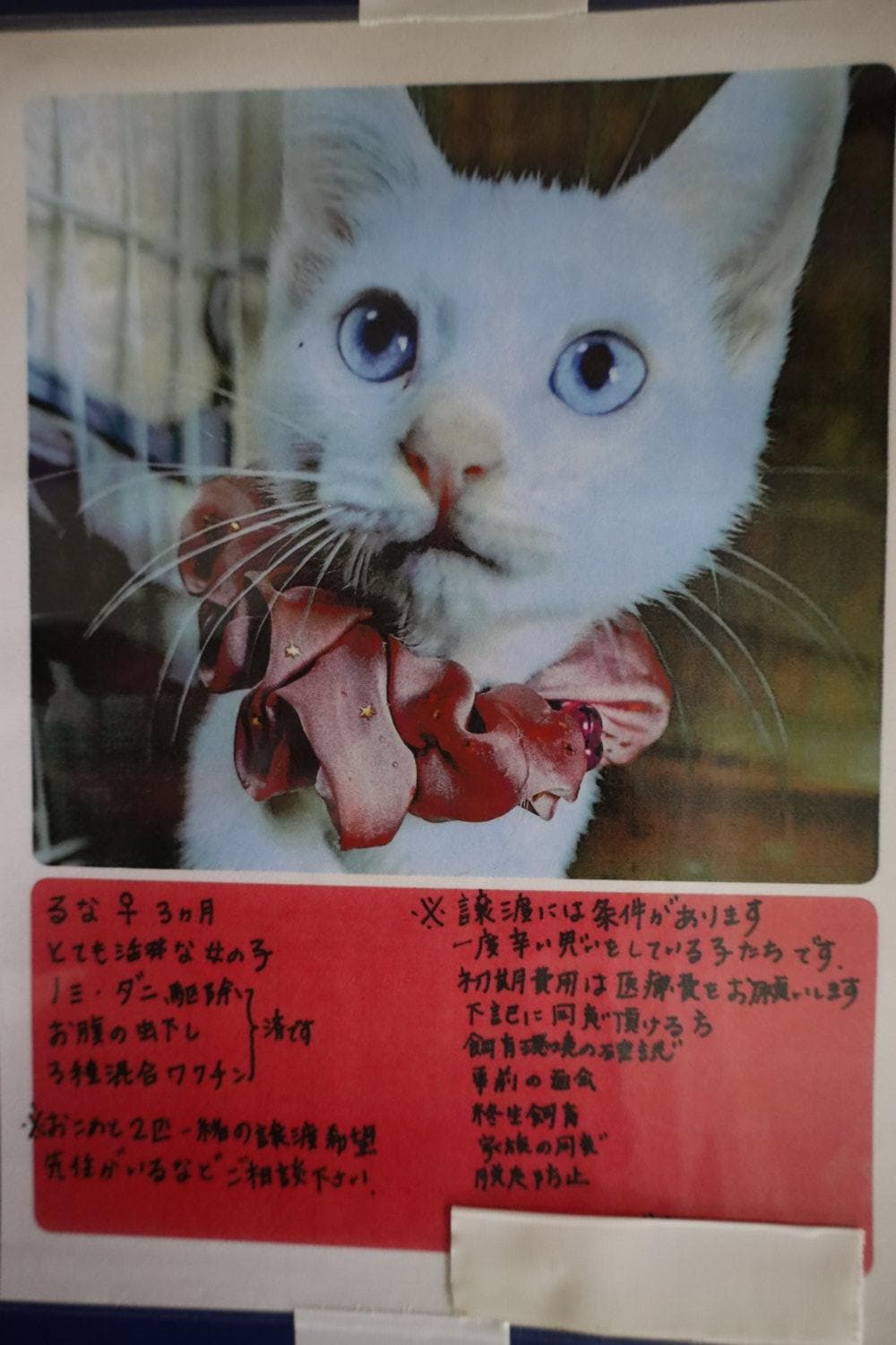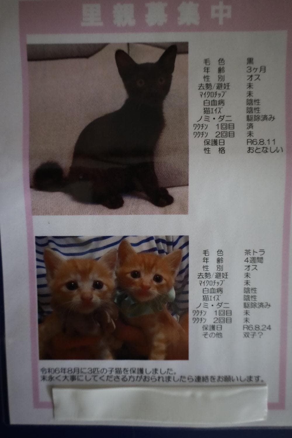 猫ちゃんの里親を募集しております。気になる方は当院の掲示板を見に来てください。お待ちしております。