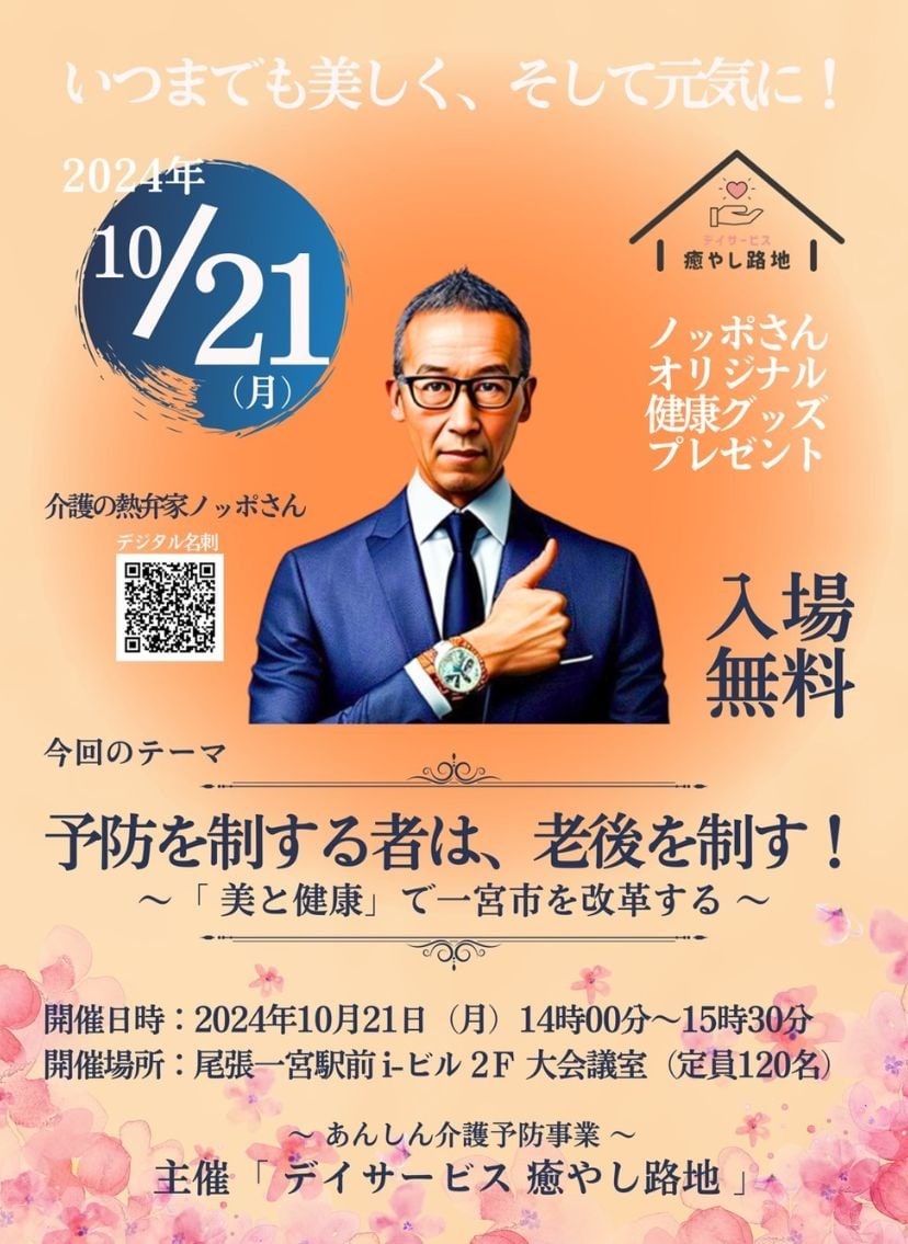 事業対象者・要支援の方が利用できる総合事業デイサービス【癒やし路地】をプロデュースしてくださっている介護の熱弁家ノッポさんをお迎えして一宮市で講演会を開催します。