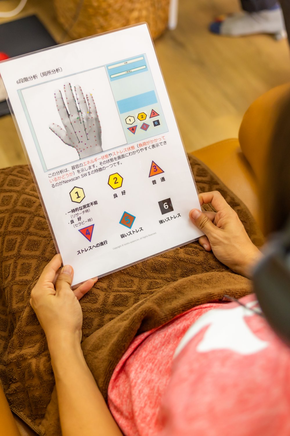 当店オススメの機器「ニュースキャン」を使い、体の周波数のズレから、ストレスや疲れがどこにたまっているのかをチェックして、フォローしていきます。