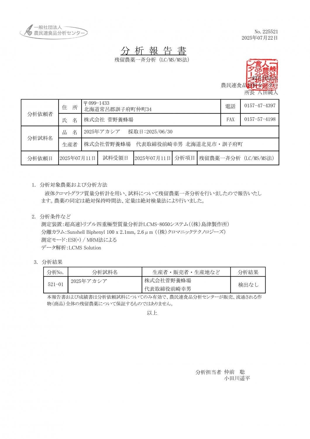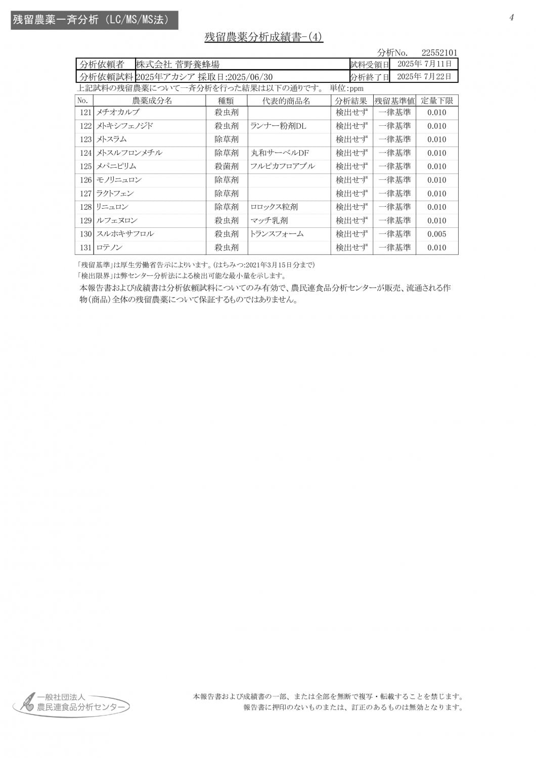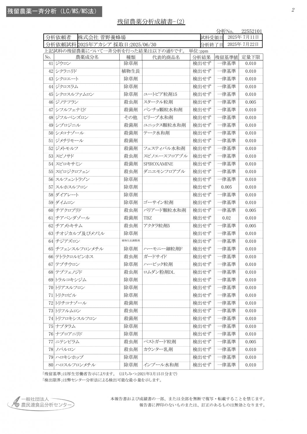 2025年7月採取 アカシア蜂蜜 残留農薬分析結果