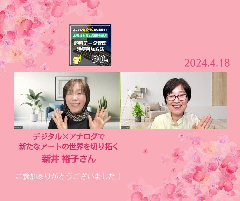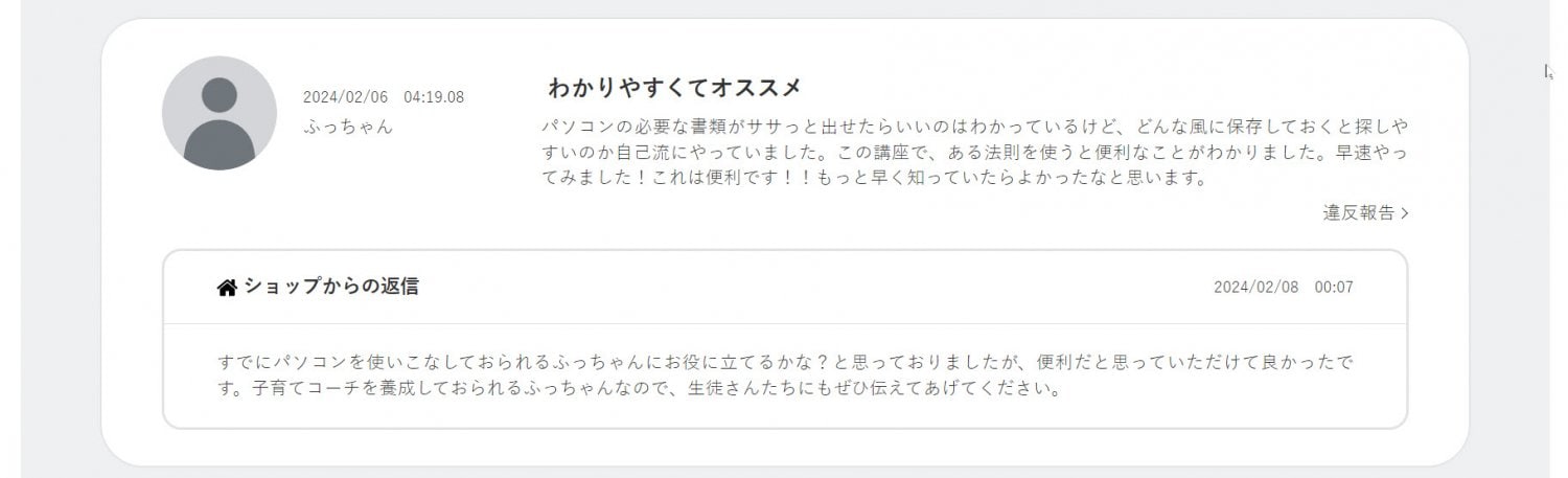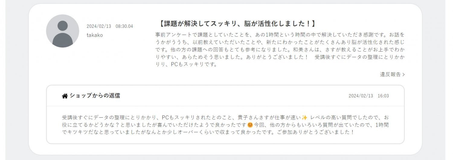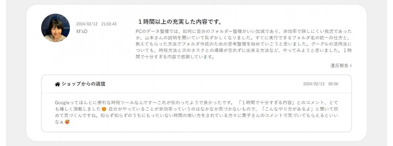 事前アンケートで課題としていたことを、あの1時間という時間の中で解決していただき感謝です。お話をうかがううち、以前教えていただいたことや、新たにわかったことがたくさんあり脳が活性化された感じです。他の方の課題への回答もとても参考になりました。和美さんは、さすが教えることがお上手でわかりやすい、あらためそう思いました。ありがとうございました! 受講後すぐにデータの整理にとりかかりり、PCもスッキリです。
