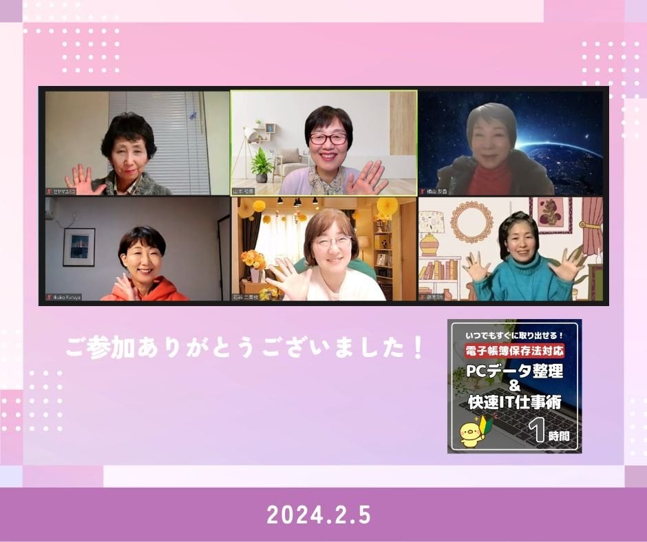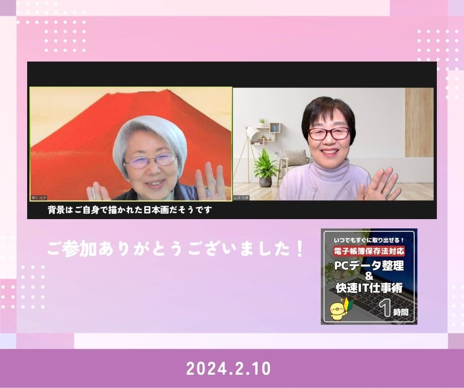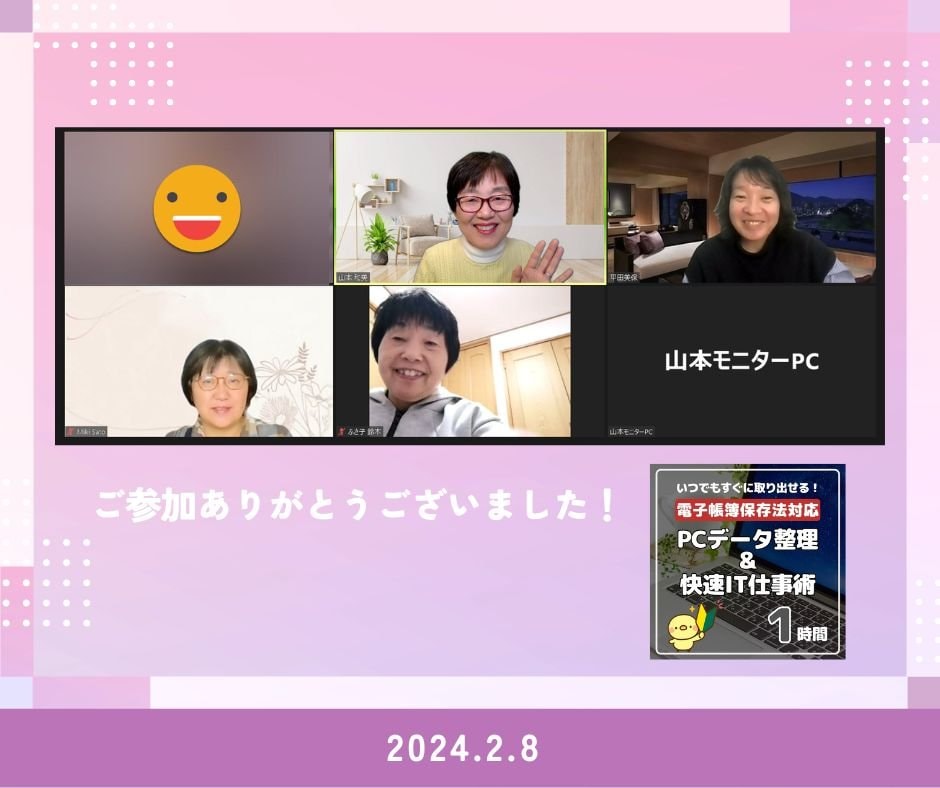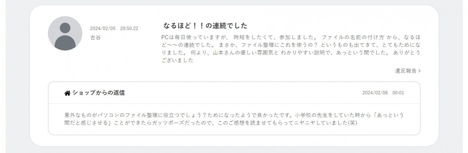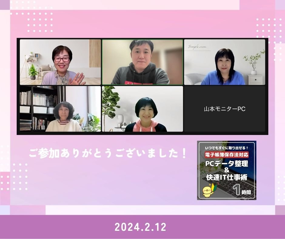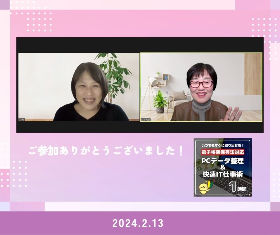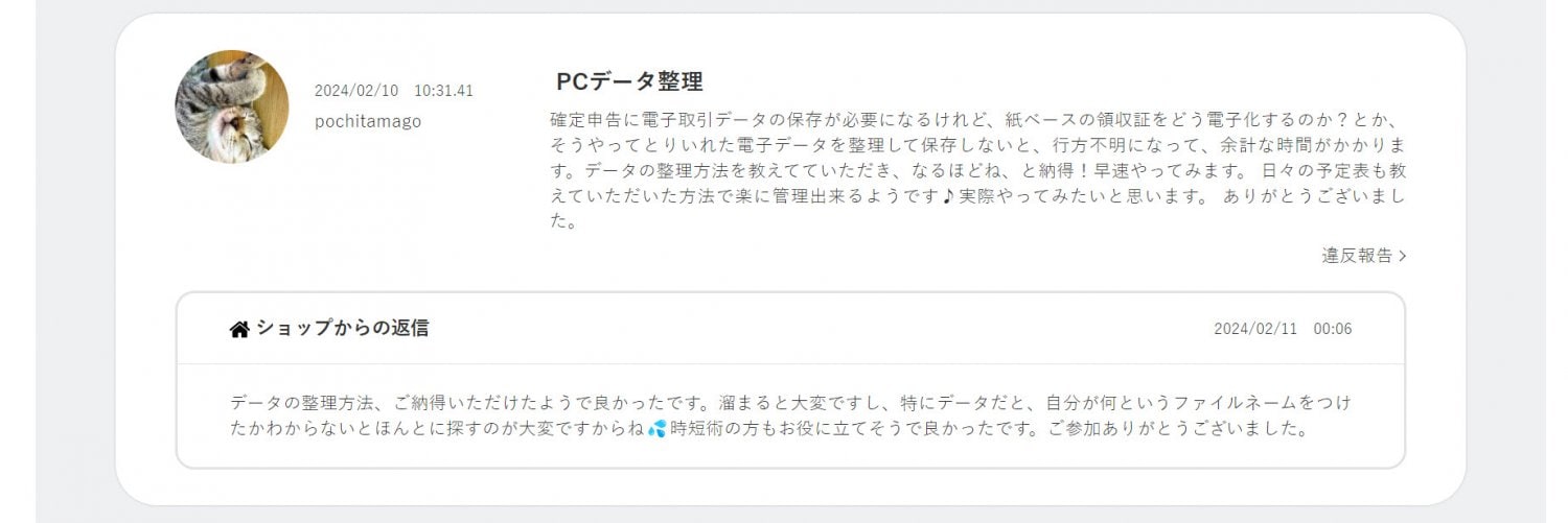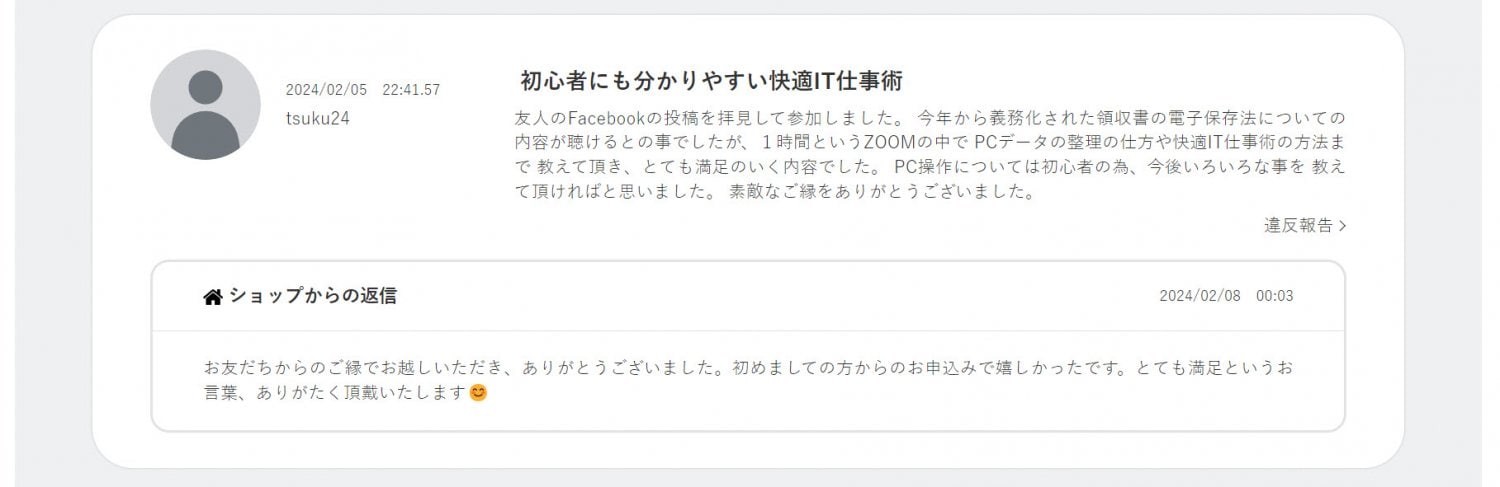 友人のFacebookの投稿を拝見して参加しました。 今年から義務化された領収書の電子保存法についての 内容が聴けるとの事でしたが、1時間というZOOMの中で PCデータの整理の仕方や快適IT仕事術の方法まで 教えて頂き、とても満足のいく内容でした。 PC操作については初心者の為、今後いろいろな事を 教えて頂ければと思いました。 素敵なご縁をありがとうございました。
