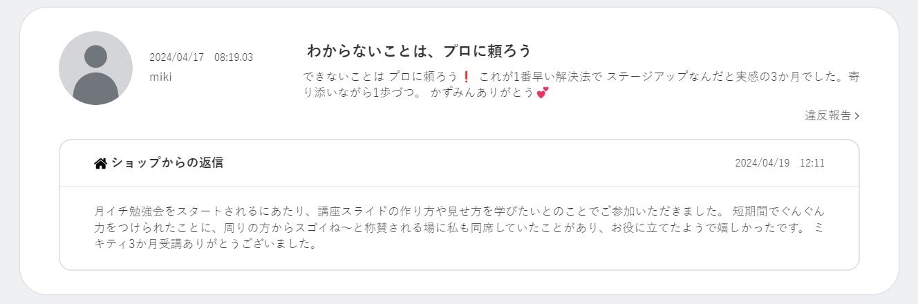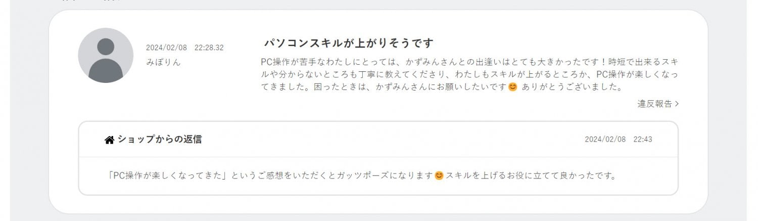 PC操作が苦手なわたしにとっては、かずみんさんとの出逢いはとても大きかったです!時短で出来るスキルや分からないところも丁寧に教えてくださり、わたしもスキルが上がるところか、PC操作が楽しくなってきました。困ったときは、かずみんさんにお願いしたいです😊 ありがとうございました。