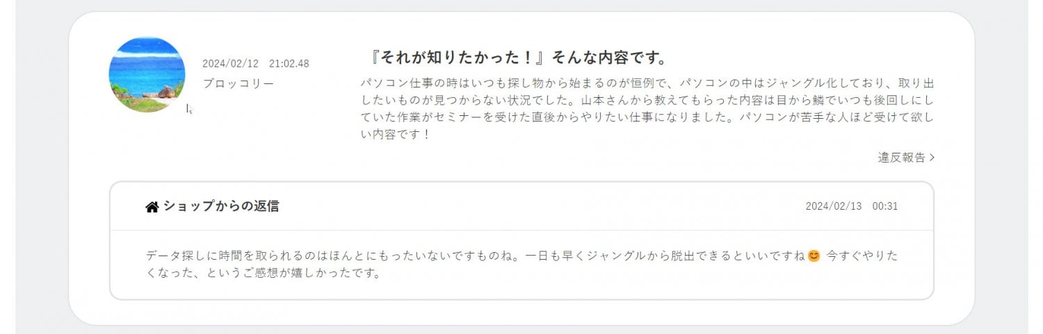パソコン仕事の時はいつも探し物から始まるのが恒例で、パソコンの中はジャングル化しており、取り出したいものが見つからない状況でした。山本さんから教えてもらった内容は目から鱗でいつも後回しにしていた作業がセミナーを受けた直後からやりたい仕事になりました。パソコンが苦手な人ほど受けて欲しい内容です!
