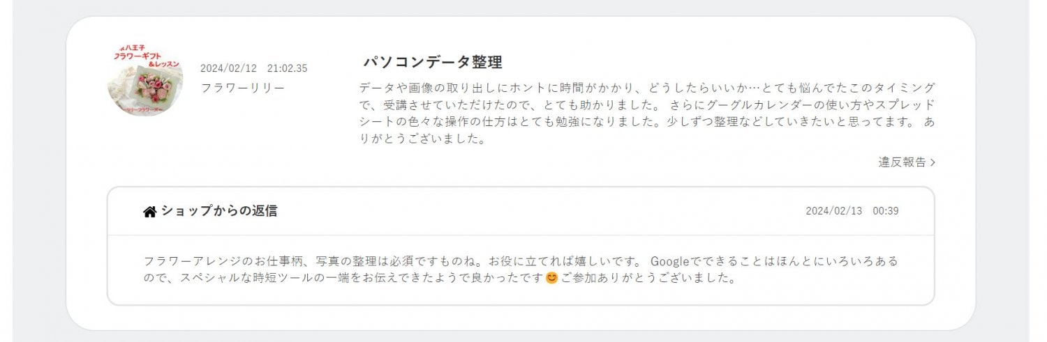 データや画像の取り出しにホントに時間がかかり、どうしたらいいか…とても悩んでたこのタイミングで、受講させていただけたので、とても助かりました。 さらにグーグルカレンダーの使い方やスプレッドシートの色々な操作の仕方はとても勉強になりました。少しずつ整理などしていきたいと思ってます。 ありがとうございました。