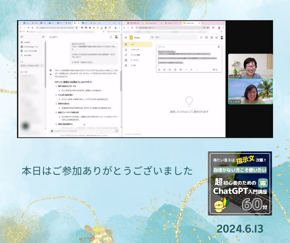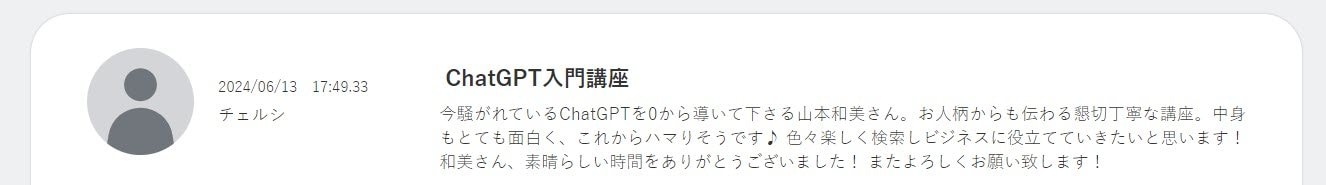 今騒がれているChatGPTを0から導いて下さる山本和美さん。お人柄からも伝わる懇切丁寧な講座。中身もとても面白く、これからハマりそうです♪ 色々楽しく検索しビジネスに役立てていきたいと思います! 和美さん、素晴らしい時間をありがとうございました! またよろしくお願い致します!