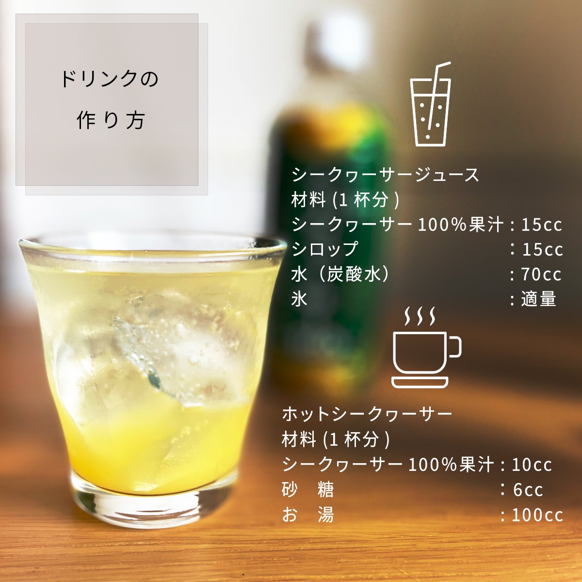 原液を水やソーダと割ってジュースにしたり、魚料理のレモンの代わりにシークヮーサーのさっぱりとした風味を楽しんだり、また泡盛のお酒割りやゼリーなどにしてもおいしく召し上がれます。