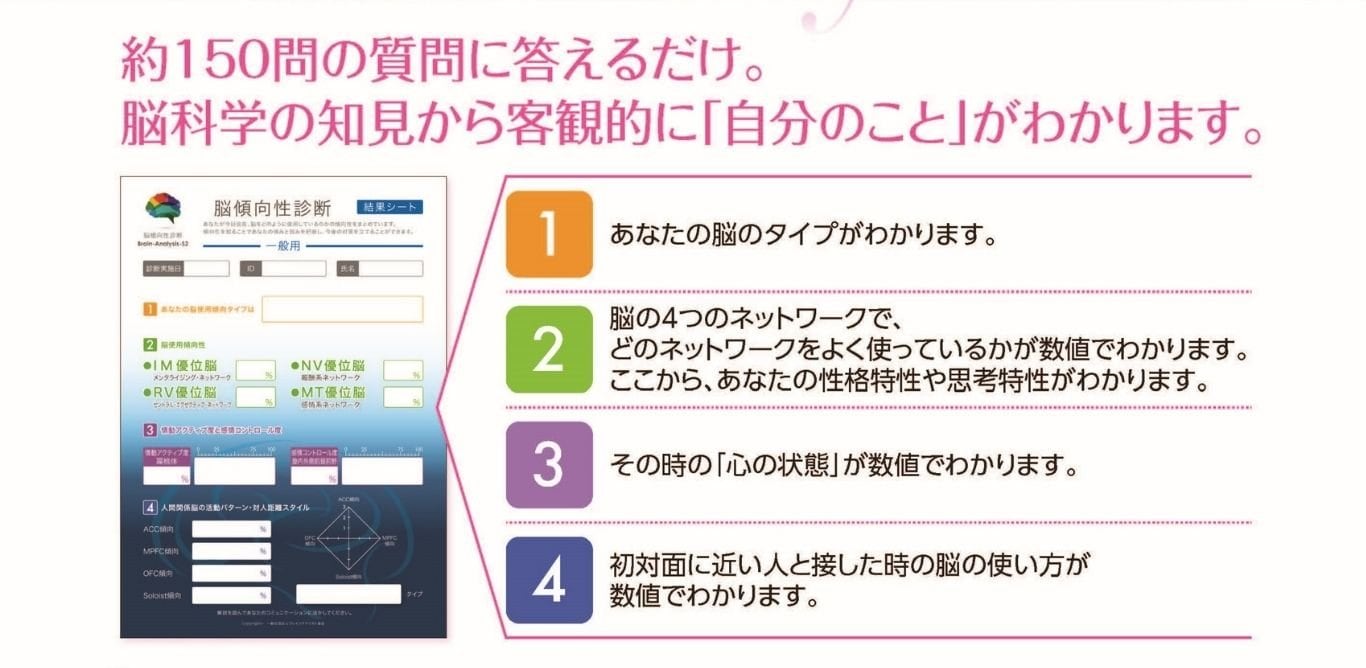 最先端の脳科学の概念と約3万人の実状に添った心理分析を取り入れた独自開発の「脳の傾向性診断テスト」を開発しています。開発には著名大学の脳科学研究者や心理学者、心理カウンセラー、脳外科の医療関係者の方々にもご協力いただいています。また、その信憑性については日本産業ストレス学会にも発表されています。